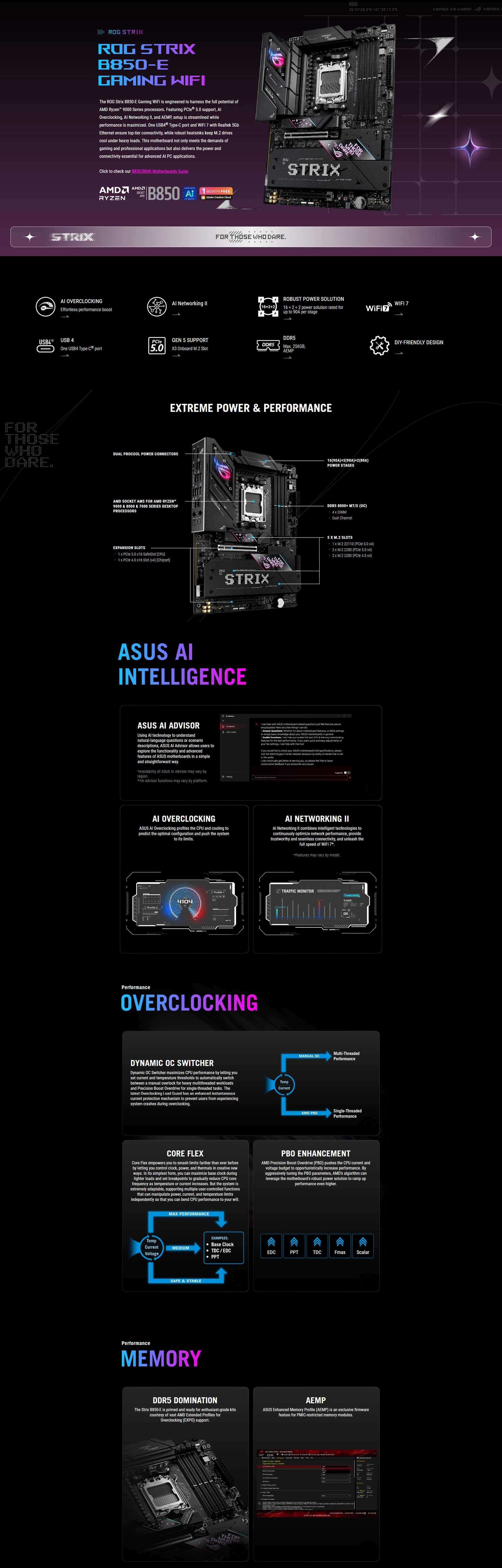 The ROG Strix B850-E Gaming WiFi is engineered to harness the full potential of AMD Ryzen™ 9000 Series processors. Featuring PCIe® 5.0 support, AI Overclocking, AI Networking II, and AEMP, setup is streamlined while performance is maximized. One USB4® Type-C port and WiFi 7 with Realtek 5Gb Ethernet ensure top-tier connectivity, while robust heatsinks keep M.2 drives cool under heavy loads. This motherboard not only meets the demands of gaming and professional applications but also delivers the power and connectivity essential for advanced AI PC applications.