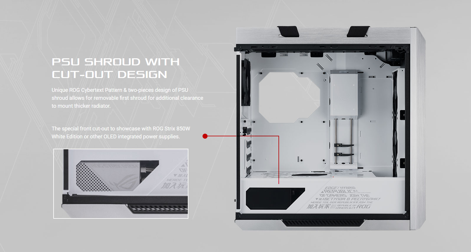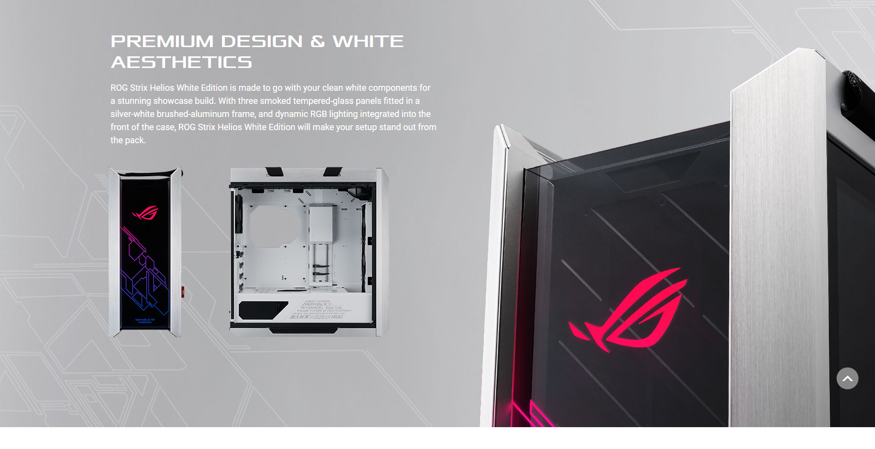ROG Strix Helios White Edition is a premium mid-tower gaming case with three tempered-glass panels, a silver-white aluminum frame and integrated front-panel RGB lighting. Built-in cable management, including a multifunction cover with GPU braces, keeps the interior sharp and tidy. Engineered for expandability and performance, it's ready for an up to EATX motherboard and serious water-cooling setups - making it the perfect choice for a unique white ROG showcase build.