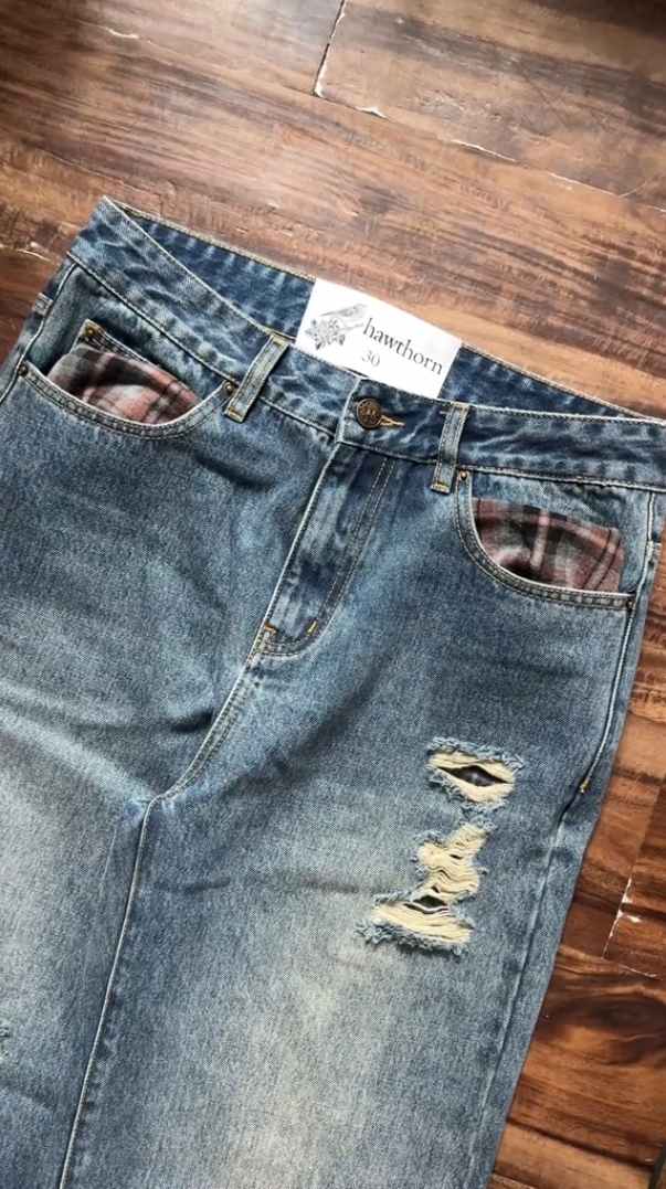 PLAID‑LINED DISTRESSED JEANS
