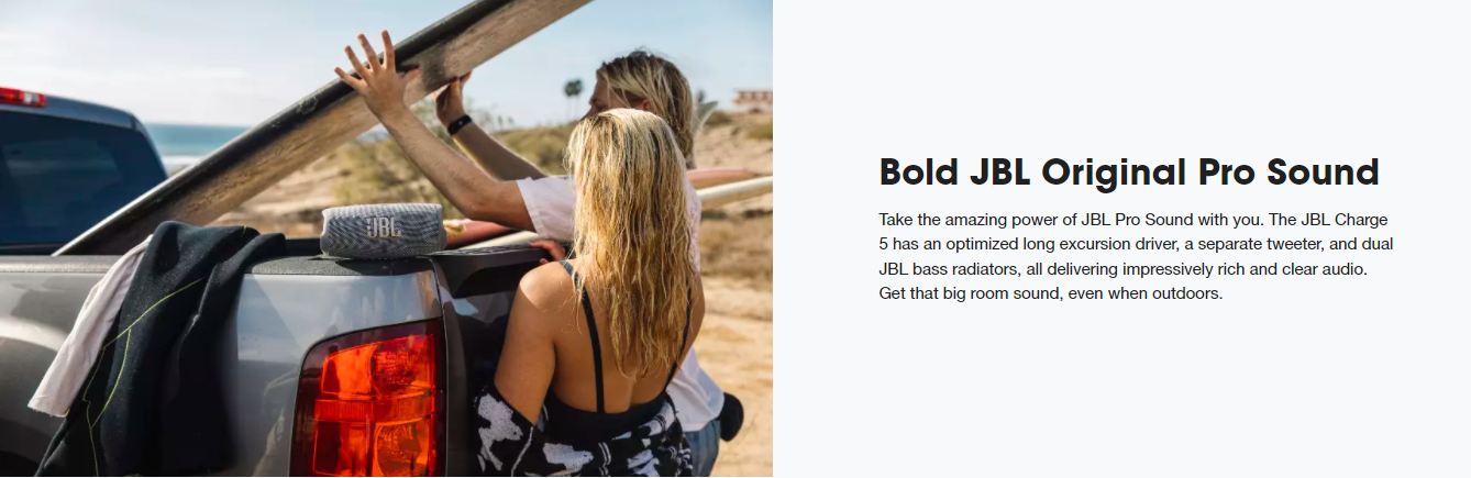 Take the party with you no matter what the weather. The JBL Charge 5 speaker delivers bold JBL Original Pro Sound, with its optimized long excursion driver, separate tweeter and dual pumping JBL bass radiators. Up to 20 hours of playtime and a handy powerbank to keep your devices charged to keep the party going all night. Rain? Spilled drinks? Beach sand? The IP67 waterproof and dustproof Charge 5 survives whatever comes its way. Thanks to PartyBoost, you can connect multiple JBL PartyBoost-enabled speakers for a sound big enough for any crowd. With all-new colors inspired by the latest street fashion trends, it looks as great as it sounds.