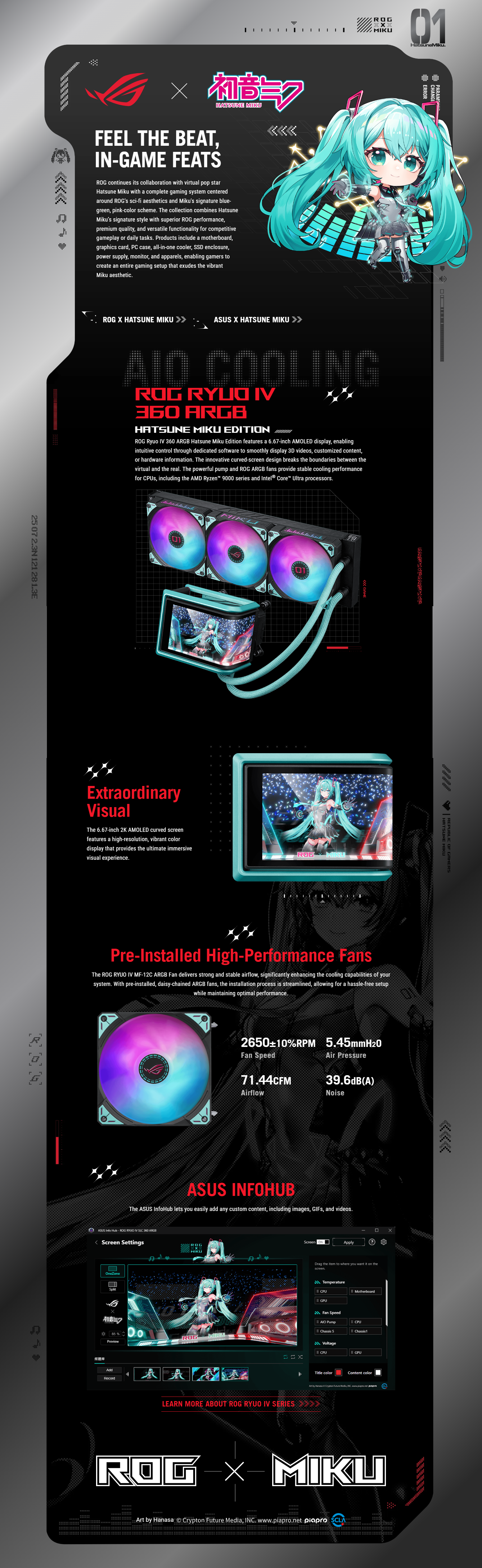 Description for ASUS ROG RYUO IV 360 ARGB Hatsune Miku Edition Liquid CPU Cooler, 6.67" AMOLED Display, 360mm Radiator, 3x 120mm MF-12C aRGB Fans, 2650 RPM Speed, 71.44 CFM Fan Airflow | 90RC01P1-B0EAY0