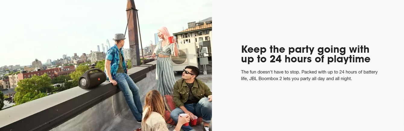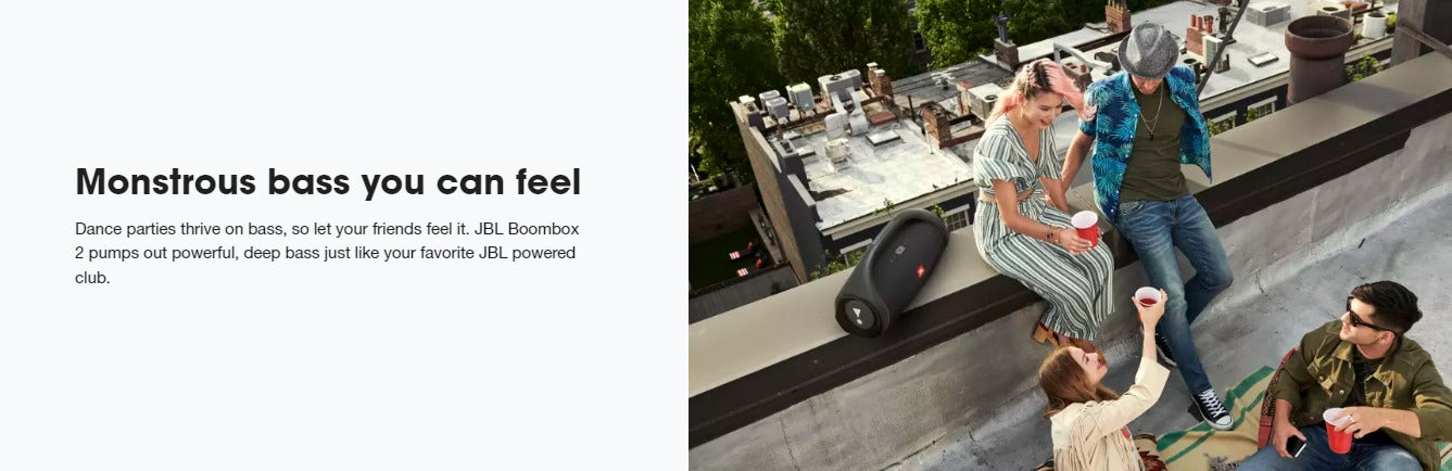 Own the party. From backyard barbecues to weekend road trips, JBL Boombox 2 brings it with monstrous bass, bold design and up to 24 hours of play time. IPX7 waterproof and portable, this powerful speaker pumps out massive sound all day and all night. Plus, you can connect other JBL PartyBoost-compatible speakers to turn the party up. JBL Boombox 2 keeps your friends dancing and its built-in powerbank keeps your devices charged. So you can groove from dusk till dawn and keep going strong!