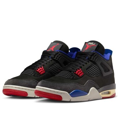 Black and royal blue Air Jordan 4 Retro "Rare Air" with Gold lettering inside shoes tongue. Features a nubuck upper, grey suede overlays, and interchangeable Velcro tongue patches. Boasts visible Air cushioning, "Rare Air" insole logo, and removable Jumpman patch. A classic, reimagined.