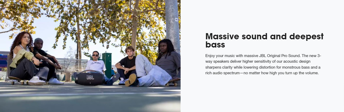 We just made our most powerful portable Bluetooth speaker even better. The iconic silhouette of the JBL Boombox 3 has a bold new update featuring a sturdy metal handle with silicone grips, twin sidecaps, and waterproof and dustproof signature fabric. It’s been redesigned inside too, added with a new subwoofer unleashing much deeper bass and massive JBL Original Pro Sound, all with lower distortion. And 24 hours of play time takes you all the way from your morning workout to a late-night hang with your friends. And for sound that’s practically limitless, instantly connect multiple speakers with the JBL Portable app.