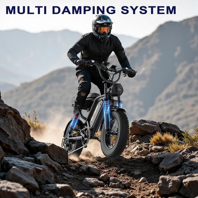 ·Feel free to contact us anytime if you have any questions about operation or performance!·Direct Message: Send us a DM anytime. [Through - My Orders -]·TIKTOK ID: Contact us via @Aovopro official·We are here to solve all your problems and ensure you're completely satisfied!·Brand: Qlaway·Motor Power: 750WBattery ·Type: Lithium (648Wh)·Speed Levels: 5 levels·hock Absorption: Front and rear dual suspension (Quad-shock system)·Brake Type: Disc brakes·Wheel Size: 16 inches·Wheel Material: Alloy steel·Frame Material: High carbon steel rack·Max Weight Capacity: 330 lbs·Minimum User Height: 4 feet 11 inches.·Skill Level: Advanced·Gear Configuration: Rear derailleur·Special Features: Multi-speed, dual suspension, mudguards, front light, rear seat·Included Components: Battery, charger, user manual, tool kit, rear seat·Product Package Dimensions: 50.4 × 13.0 × 33.9 inches【750W MOTOR】 – The Qlaway 750W electric bike features a copper-wound brushless motor, with a top speed of 25 mph and a 30° climbing ability. It provides 80Nm of torque and comes with a 7-speed gear system for smooth riding.【48V 13.5Ah BATTERY】 – The 648Wh battery offers a range of 30-70 miles per charge. Charging time is about 6 hours, and the battery is removable for indoor or outdoor charging.【FULL SUSPENSION】 – Front and rear quad-shock suspension ensures a comfortable ride on various terrains, including city streets, mountain trails, snow, and beach roads.【5 SPEED LEVELS】 – The bike has a large smart LCD display, with 5 speed levels adjustable from 6 to 25 mph. Speed settings can be customized via the app.【CRUISE CONTROL】 – The cruise control function activates after 8 seconds of steady riding, providing a relaxed ride. Any acceleration or braking will deactivate the function.