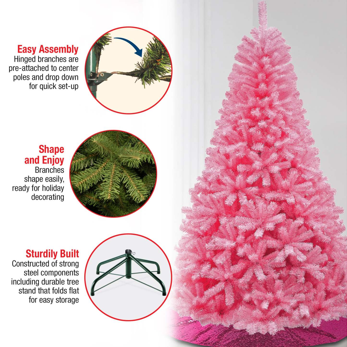 The Color Pop series of Christmas trees offer a unique and engaging alternative to the traditional green holiday centerpiece. Designed in a traditional cone shape, this tree is thick with branch tips that are a rich shimmering pink color. This three-section tree is crafted with high quality materials and hinged branches for easy set up and includes a sturdy metal folding stand. For indoor display only.
