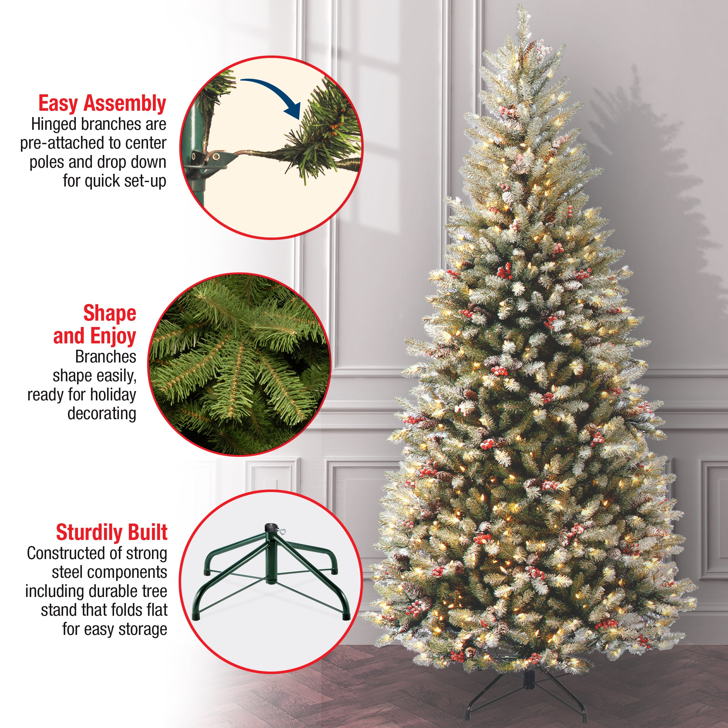 The Dunhill Fir® is a slim profile tree ideal for display in corners, small rooms, and areas with limited space. It comes pre-lit with 600 clear lights for an elegant holiday glow, and is adorned with pine cones, red berries, and a touch of snow for a festive look. Hinged branch construction make setup and takedown a breeze. Metal folding stand include, for indoor use only. Plug in.