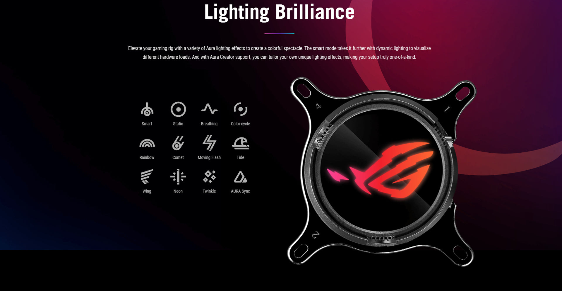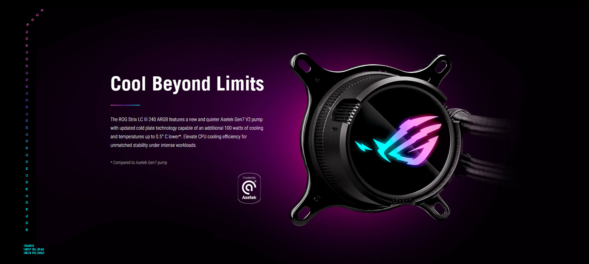 Achieve optimal performance and stunning aesthetics with the ROG Strix LC III 240 ARGB, featuring the latest generation Asetek’s new Gen7 v2 pump and ROG ARGB radiator fans. Effortlessly tackle the heat generated by AMD Ryzen™ and Intel® Core™ processors to unleash limitless power. Enjoy enhanced installation flexibility with a 360° rotatable water block that accommodates various mounting options. Explore a spectrum of Aura lighting modes to elevate the visual appeal of your gaming build. And embrace the perfect blend of efficiency and exquisite design for an