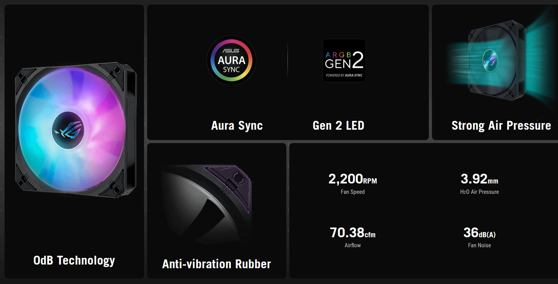 | Fan | Fan: ROG STRIX AF-12S ARGB FAN - Size: 2 x Fan Slots (120mm) - Dimension: 120 x 120 x 25 mm - Speed: 800 - 2200 RPM ± 10% (0 RPM Support) - Static Pressure: 3.92 mmH2O - Air Flow: 70.38 CFM - Noise: 36 dB(A) - Control Mode: PWM/ DC |