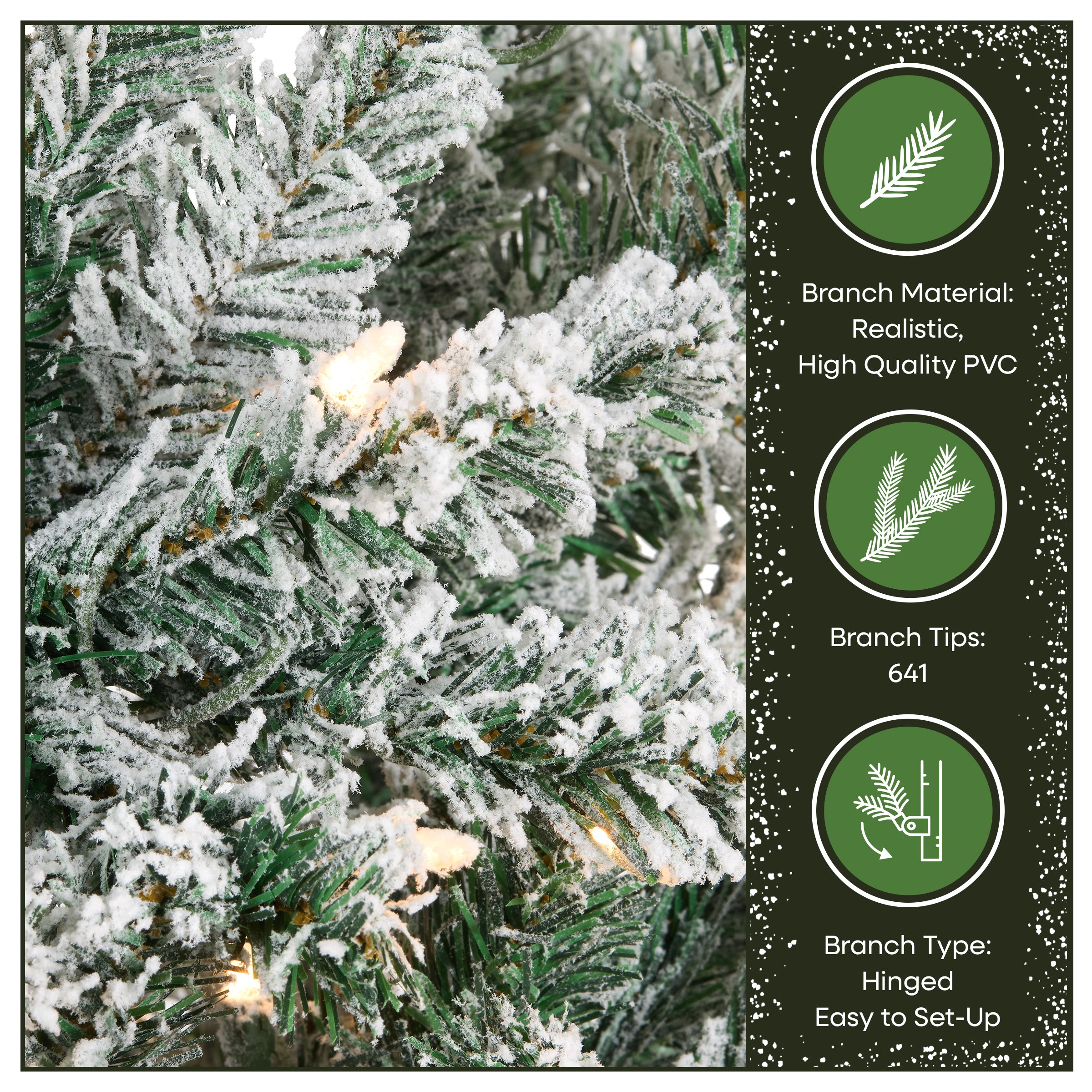 The Acacia tree offers a slim profile tree that is great for display in corners, small rooms and areas with limited space. This tree features flocked branches giving the appearance of freshly fallen snow. It ispre-lit with 350 clear lights that remain lit even if a bulb burns out. This tree features hinged branches for ease of assembly. Sturdy folding metal tree stand is included. Plug in.