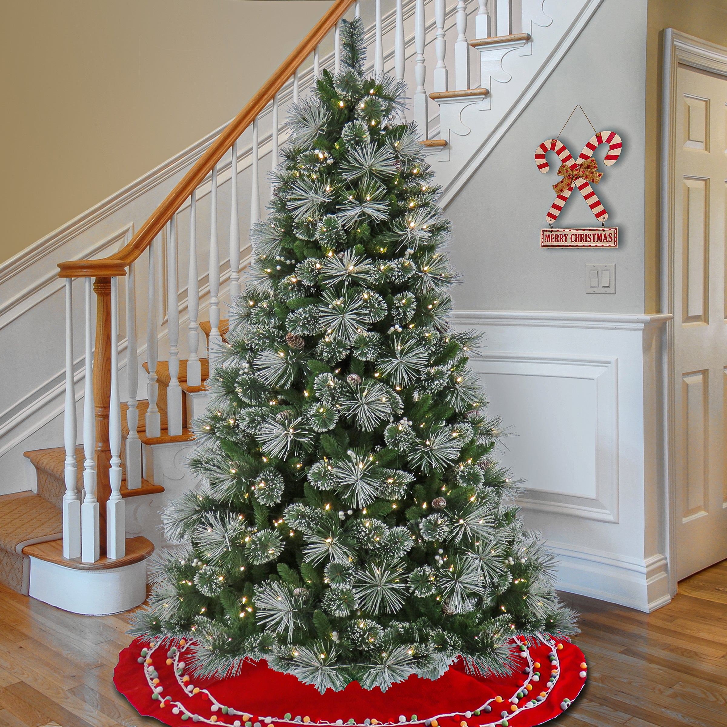The Bryson Pine is a mixed branch tree featuring soft bristle tips that are dusted with the look of freshly fallen snow. This tree is also trimmed with pinecones and white berries for added natural appeal. It is pre-lit with 500 warm white LED lights that are energy-efficient and long lasting. This three-section tree is crafted with high quality materials and hinged branches for easy set up and includes a sturdy metal folding stand. For indoor display only. Plug in.
