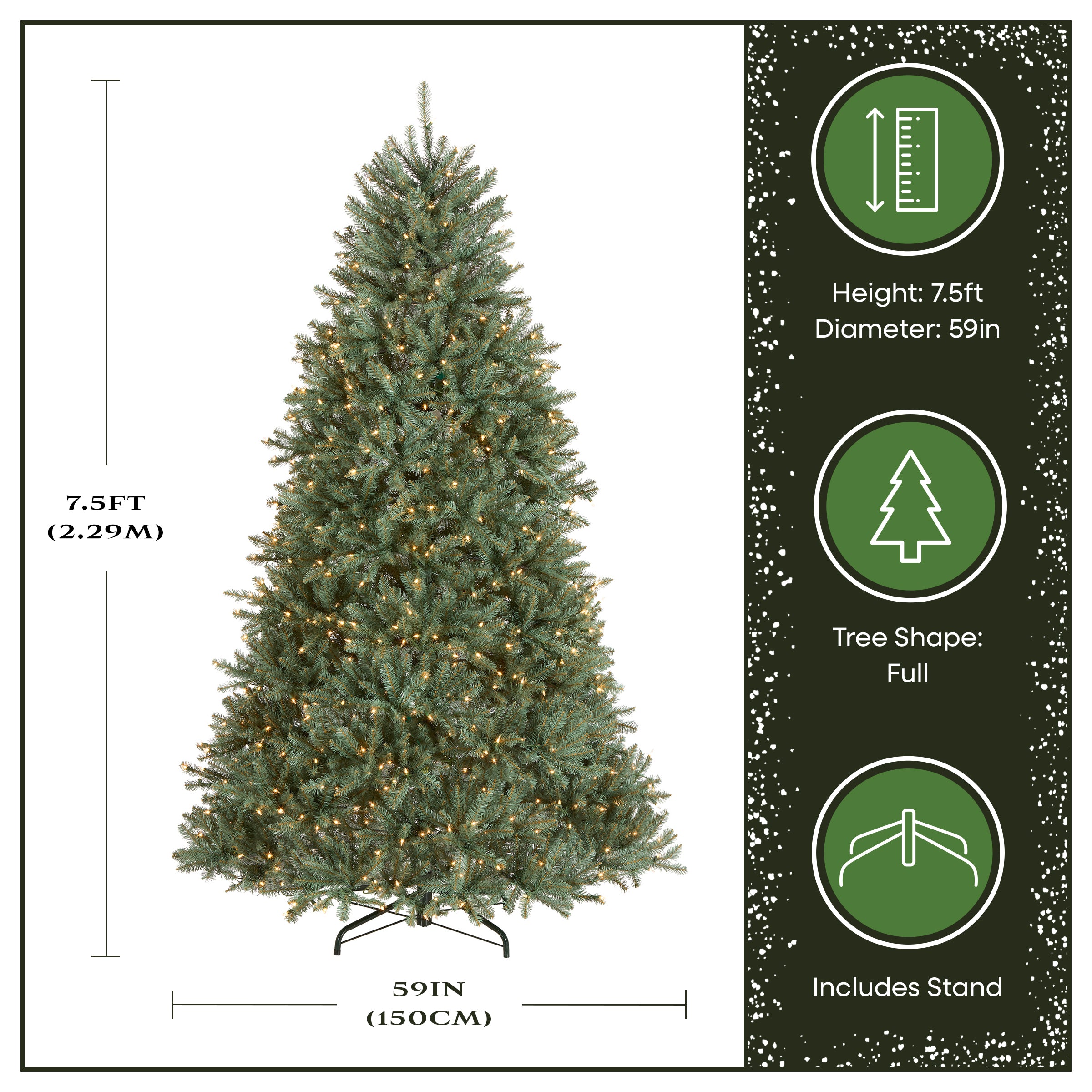 - CHRISTMAS DECORATION DIMENSIONS: This 7.5 foot tree with a full profile is perfect to display in large rooms or main living areas such as living rooms or dining rooms (Dimensions: 59”L x 59”W x 90”H)