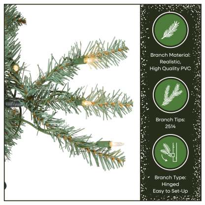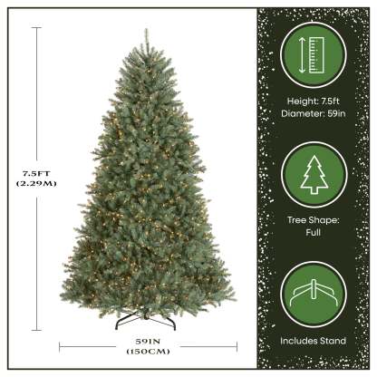 - LIFELIKE PRELIT CHRISTMAS TREE: 7.5 foot pre-lit Christmas tree with a 59 inch diameter features 2,514 realistic, blue, high quality PVC branch tips that deliver a natural, full-body appearance