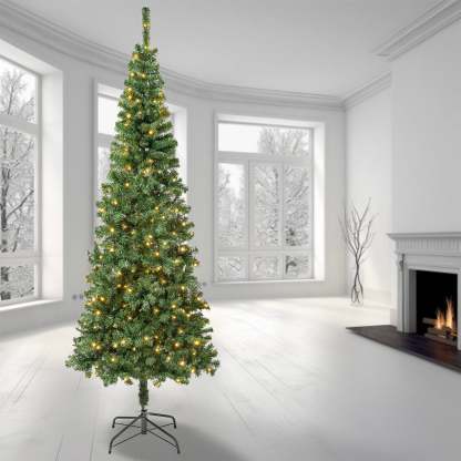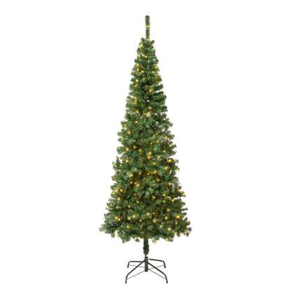 This Linden Spruce tree offers a slim profile tree that is great for display in corners, small rooms and areas with limited space. It is pre-strung with 300 warm white LED lights that remain lit even if a bulb burns out. This tree features wrapped branch construction for ease of assembly. Sturdy folding metal tree stand is included. Plug in.