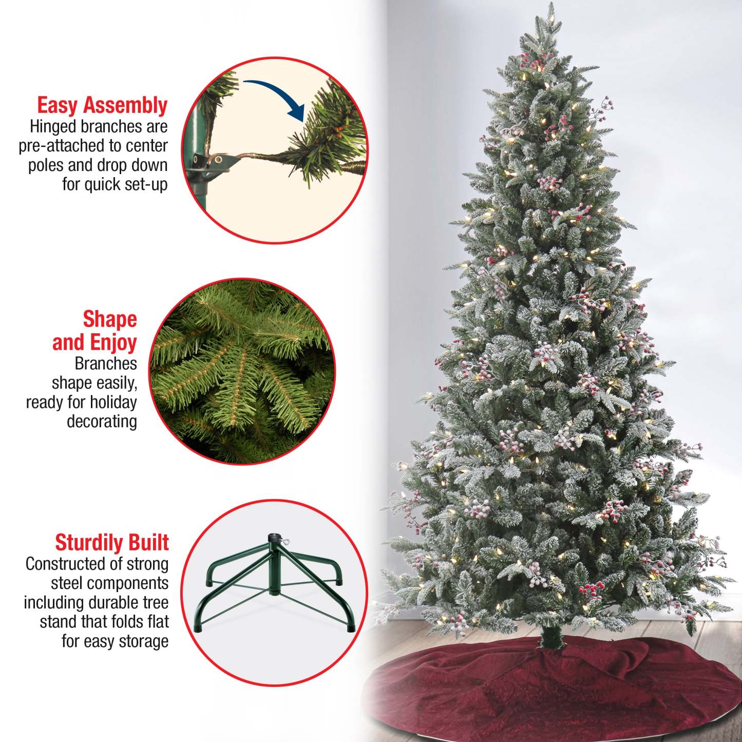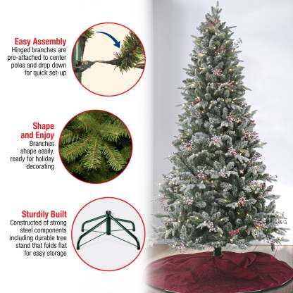 The Snowy Poechmann Fir tree features Feel Real® branch tip technology, creating a tree with remarkable realism. These crush-resistant branch tips are molded from real tree branches for an authentic living tree appearance. This tree is trimmed with red berries and dusted with the look of freshly fallen snow. It also offers a slim profile making it a great choice for display in corners or rooms with limited floor space. It is pre-strung with 400 warm white LED lights that are long lasting and energy efficient. This three-section tree is designed with hinged branches for ease of assembly. Sturdy folding metal tree stand is included. Plug in.