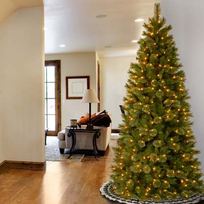 The Tacoma Pine Slim is a mixed branch tree featuring bristle tips for a softer appearance. This thin profile tree is a great choice for display in corners or areas with limited space. It is pre-strung with 500 clear lights that remain lit even if a bulb burns out. This three section tree features hinged branches for ease of assembly. Sturdy folding metal tree stand is included. Plug in.