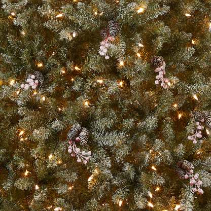 The Dunhill Fir® tree features snow sprinkled branch tips and is trimmed with clusters of red berries and pinecones. It is pre-strung with 700 clear lights that remain lit even if a bulb burns out. This tree features hinged branch construction for ease of assembly. Sturdy metal tree stand is included. Plug in.
