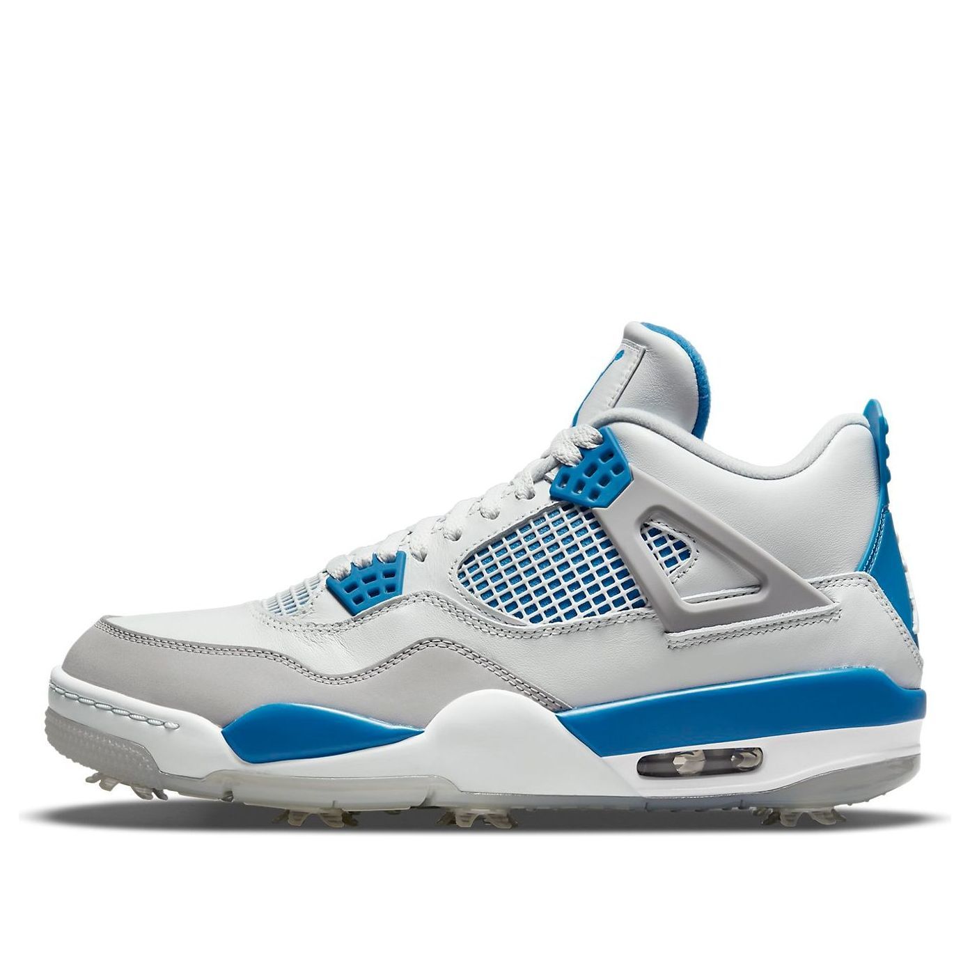 The Air Jordan 4 Golf ‘Military Blue’ is a mid-top shoe that replicates the look of the OG Air Jordan 4. It features a white leather upper with Nike AIR branding on the blue molded heel tab. The shoes also have additional blue accents on the TPU eyelets, Jumpman-branded tongue tag, and beneath the white netting on the quarter panel and throat. They are finished with a subtle grey finish on the forefoot overlay and structural wings. These shoes provide superior grip during rotational movements, making them perfect for golfers.