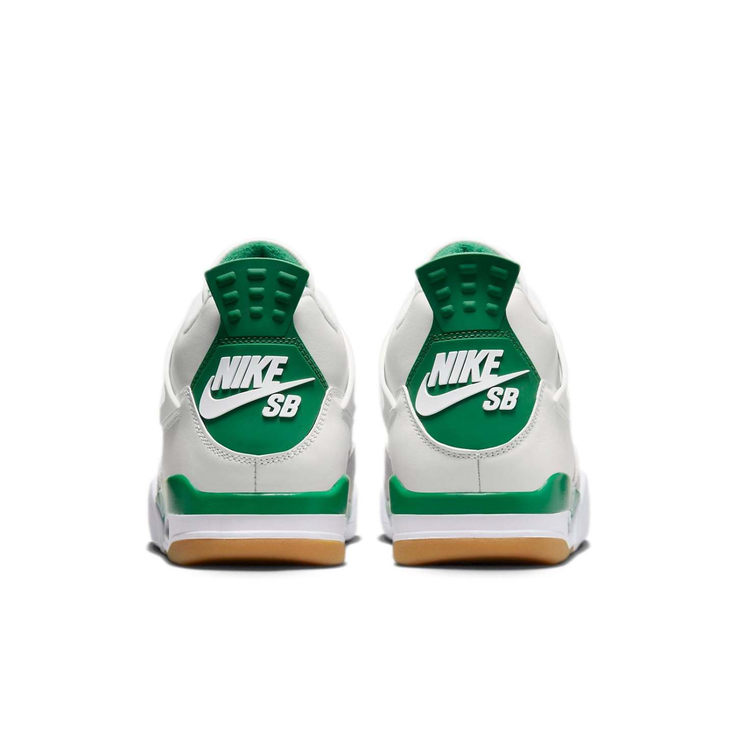 The Air Jordan 4 Retro SB 'Pine Green' offers a modernized skate rendition of the legendary silhouette. Crafted from off-white leather, it has a light grey suede forefoot overlay for enhanced durability. Further detailing includes green accenting on the molded eyelets and heel tab, as well as an embossed Nike SB logo for subtle branding. A crimson Jumpman on the tongue further enhances the look, complemented by its two-tone foam midsole with an exposed Air-sole unit in the heel, and a gum rubber outsole for reliable traction. Ideal for loyal fans of the Air Jordan 4 shoes collection.