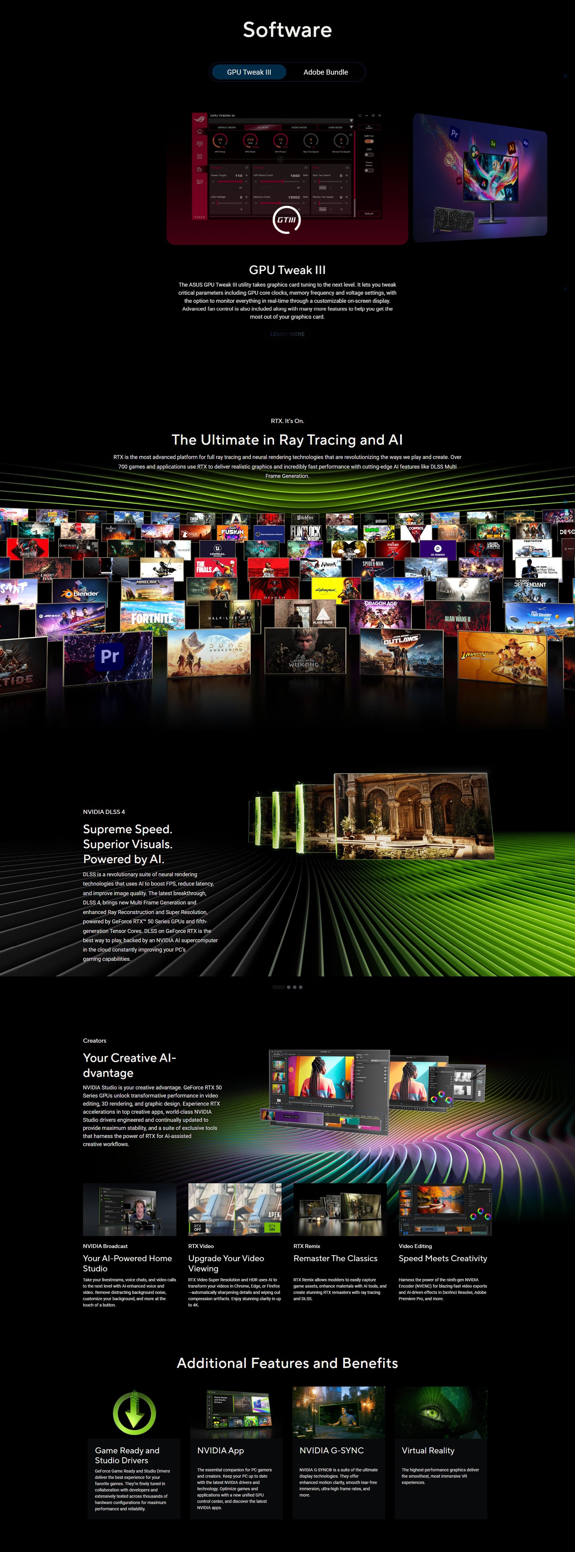 | Software | ASUS GPU Tweak III & MuseTree & GeForce Game Ready Driver & Studio Driver: please download all software from the support site. |