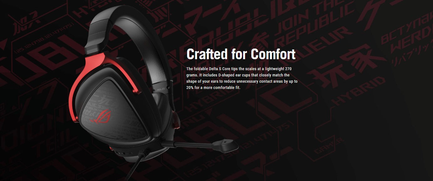 The Delta S Core features exclusive 50 mm ASUS Essence drivers in airtight chambers to provide high-resolution audio. The drivers feature a wide frequency response of 20 Hz–40 kHz to provide crystal-clear highs, incredibly strong bass, and are tilted by 12° in each ear cup to channel audio directly into the ear canal.