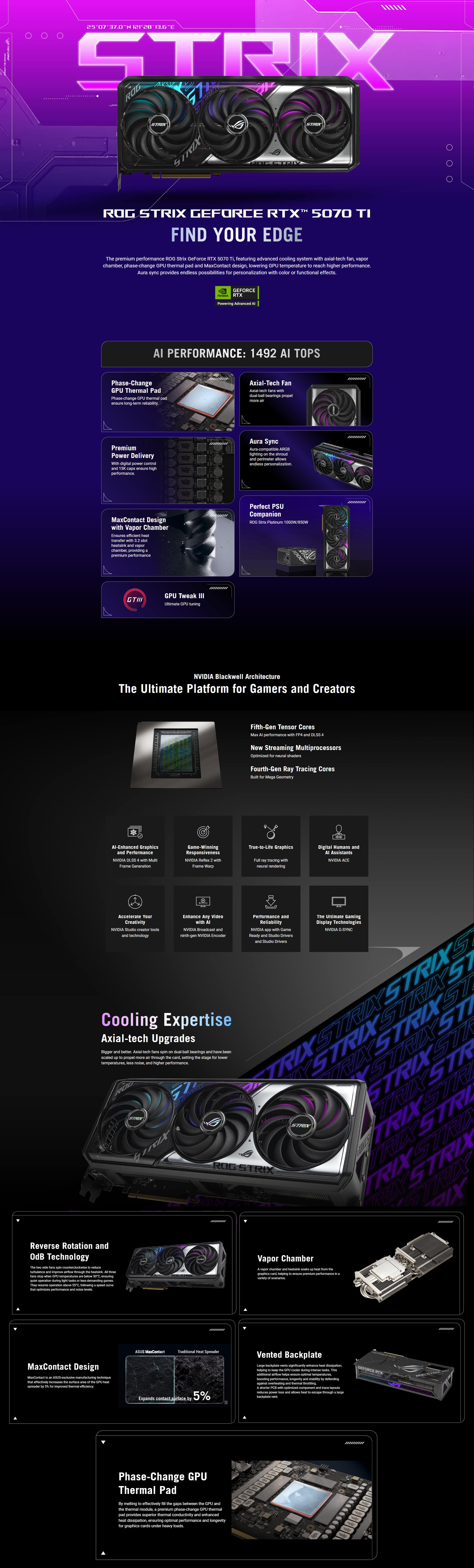 The ROG Strix GeForce RTX™ 5070 Ti OC Edition 16GB GDDR7 with advanced cooling system provides you premium power delivery.