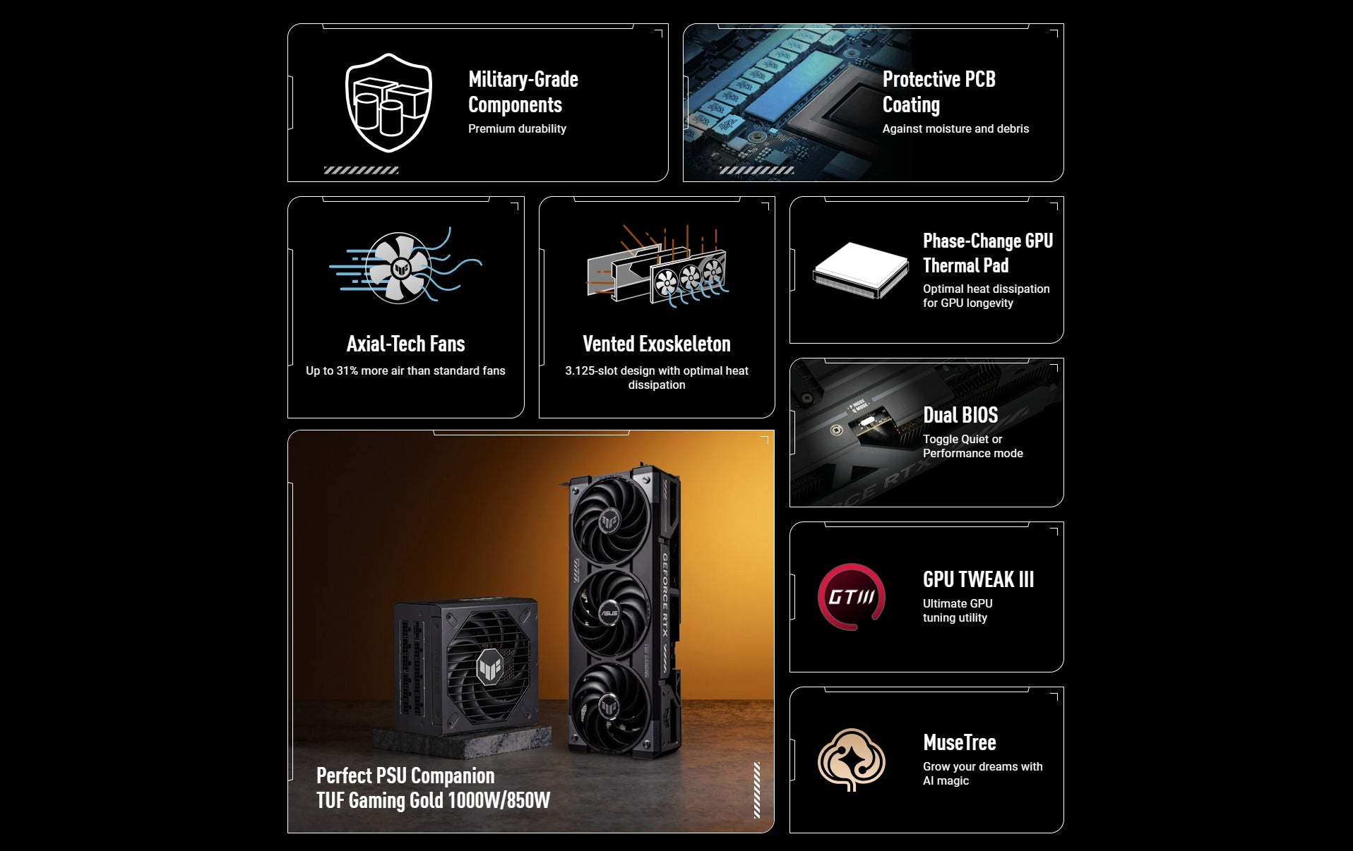 | Software | ASUS GPU Tweak III & MuseTree & GeForce Game Ready Driver & Studio Driver: please download all software from the support site. |
