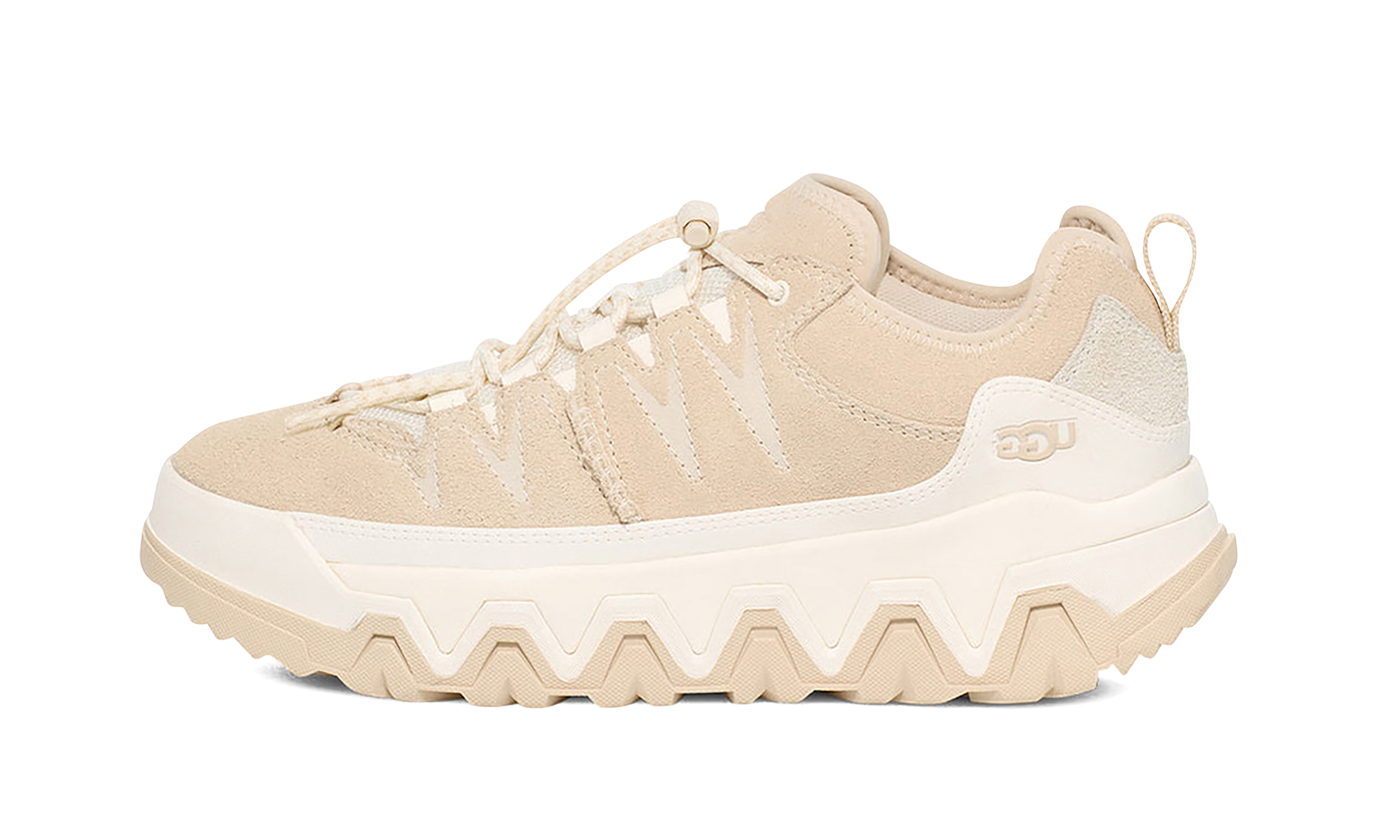 Ready for trail-to-town adventures, the UGG CapTrail Low Wmns "Light Beige", your essential Active Sneaker, perfectly blends outdoor performance with casual style. This low-top features a breathable textile upper made with recycled polyester fibers and durable suede overlays. It's engineered with a lightweight EVA footbed and the responsive SugarSole™ EVA outsole, providing superior cushioning and durable traction. A stylish, cushioned tongue adds support and comfort to this versatile, everyday shoe.