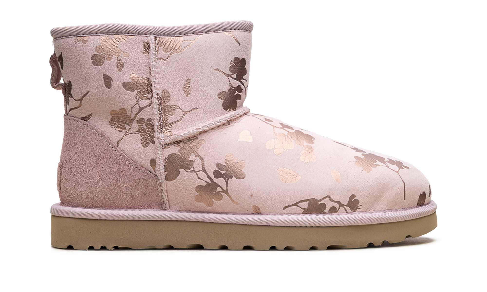 Turn heads with the UGG Classic Mini WMNS "Floral Foil Pink Red Fleece Lined", the dazzling Gilded Ankle Boot. This women's mini boot updates the iconic silhouette with a shimmering metallic floral foil print on the suede upper. Lined with the ultra-plush, warm UGGplush™ wool blend, it offers luxurious softness and comfort. Finished with a flexible Treadlite by UGG™ outsole for reliable cushioning and traction, this boot effortlessly blends iconic cozy appeal with high-fashion detail.
