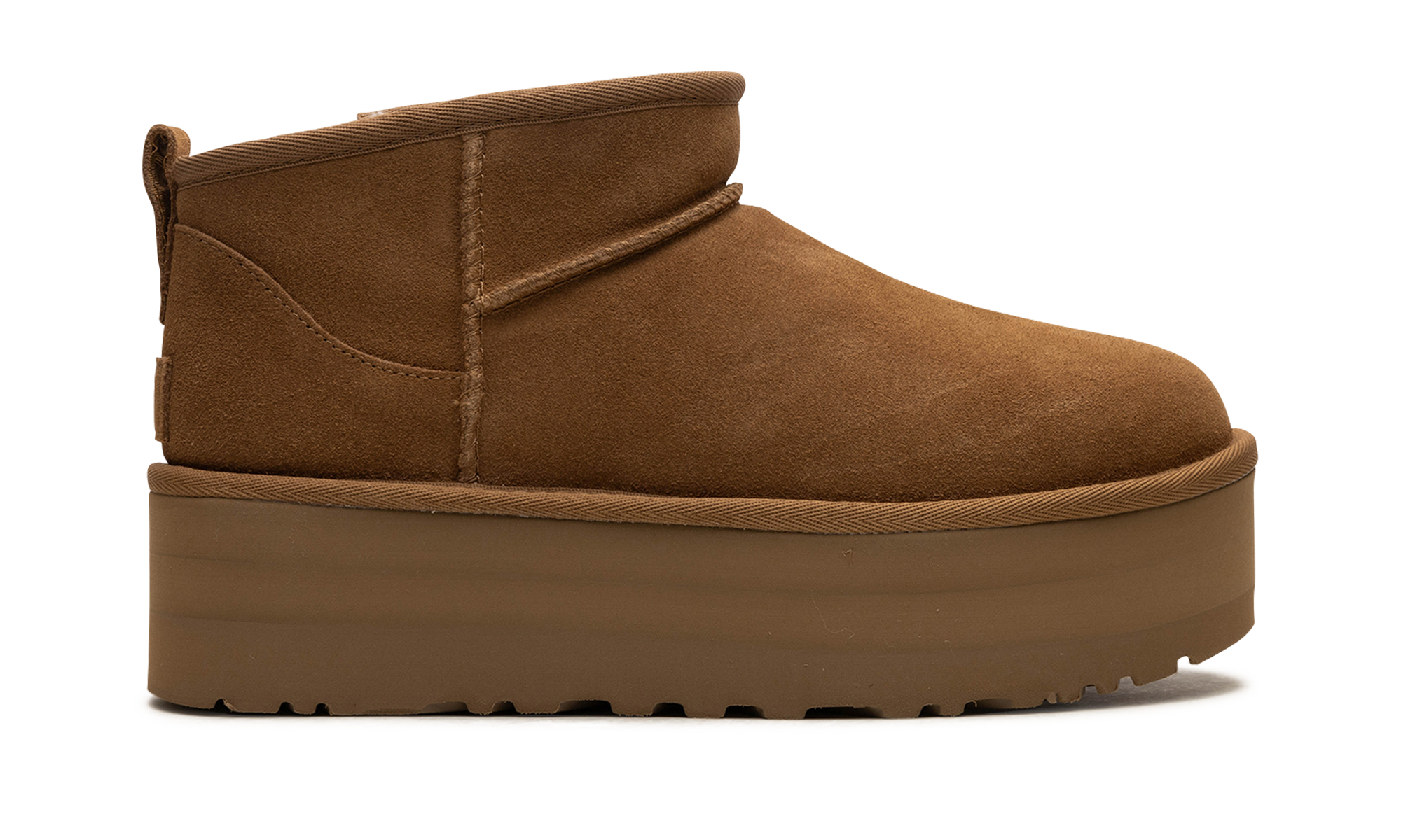 Step into luxurious height with the UGG Classic Ultra Mini Platform Wmns "Chestnut". This women's boot features a fashionable platform sole and a rich chestnut suede upper. The plush sheepskin lining ensures supreme warmth and comfort, making it a perfect choice for stylishly running errands or cozy indoor wear.