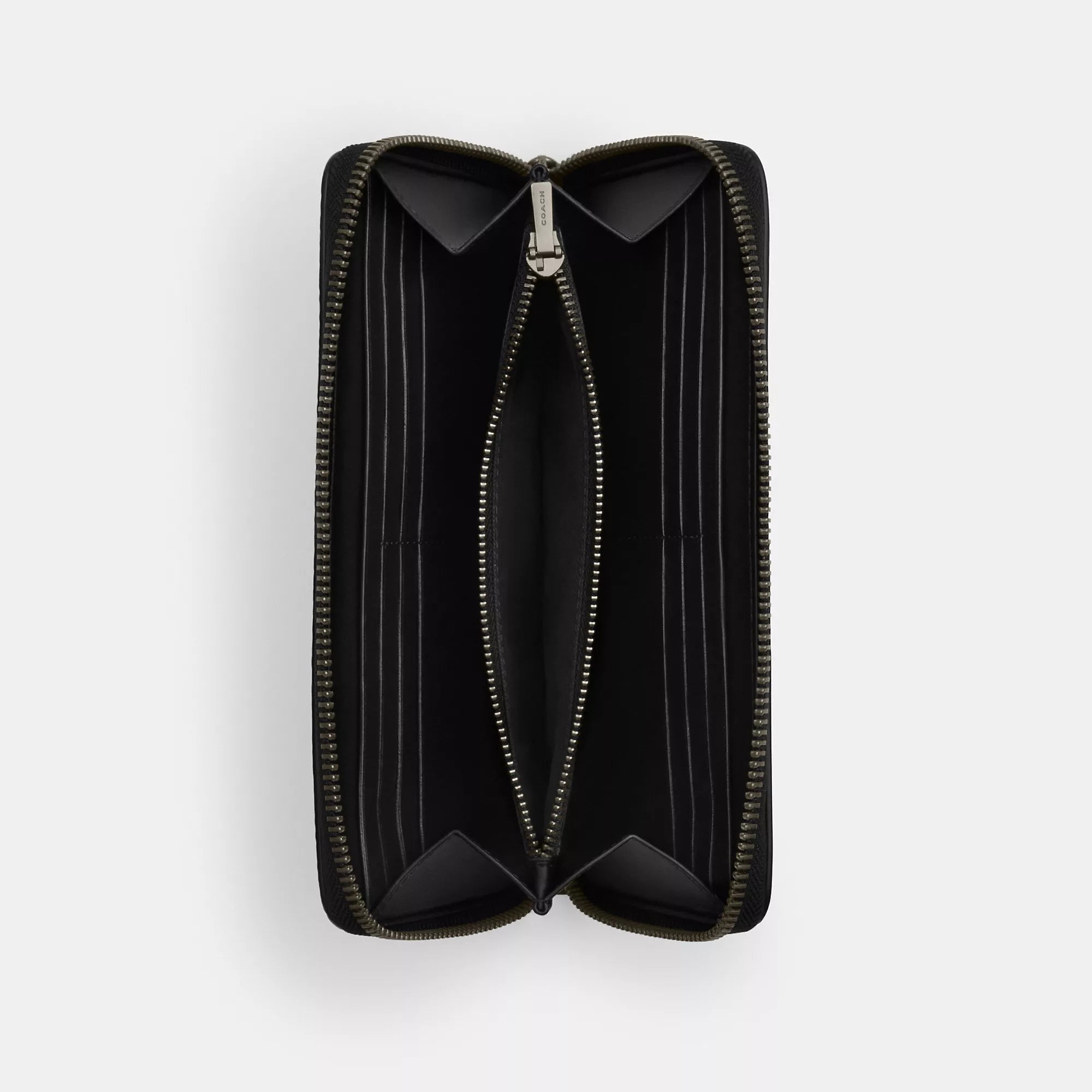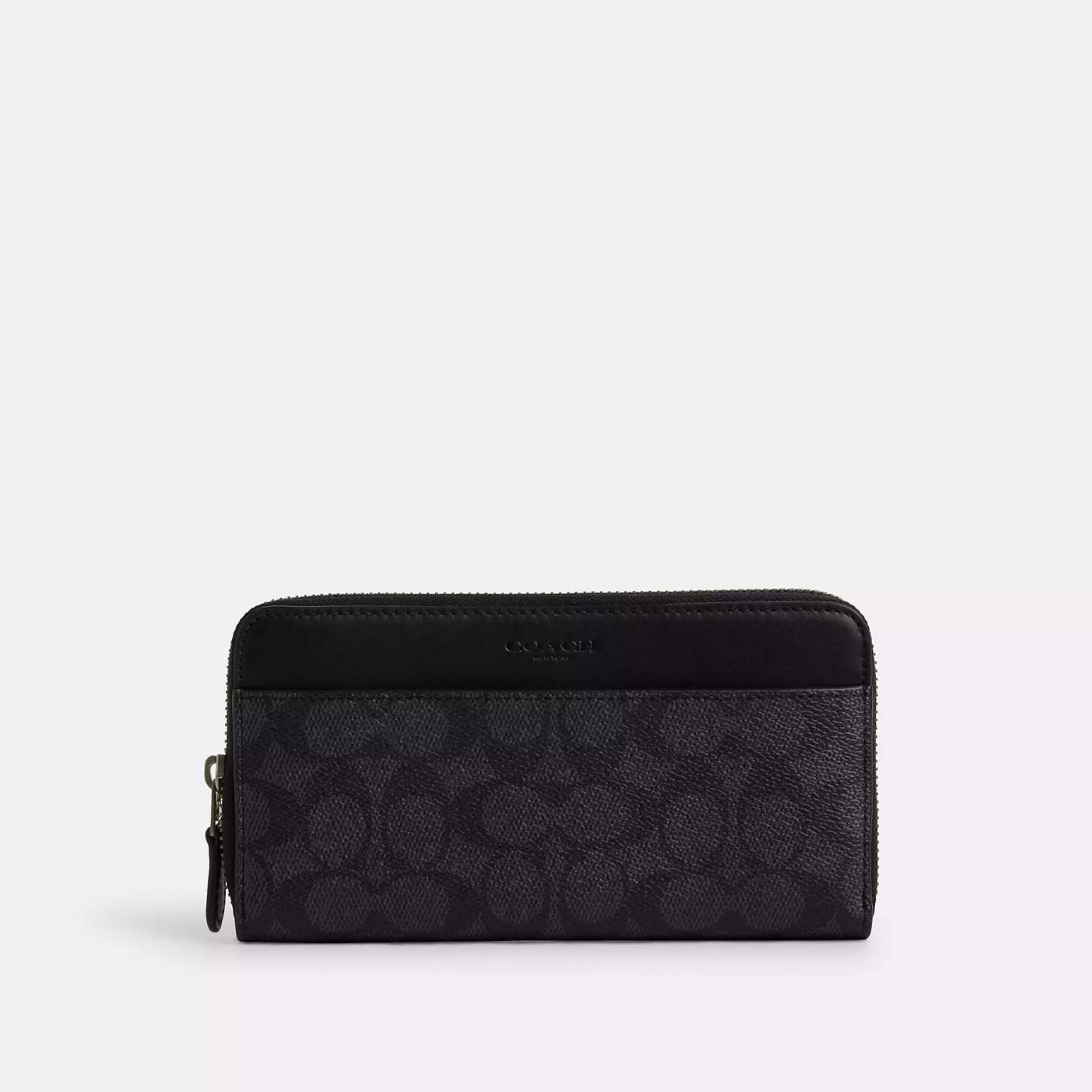 Signature coated canvas and smooth calf leather 12 credit card slots Full-length bill compartments Zip coin pocket Zip-around closure Outside open pocket 7 1/2 (L) x 4 (H) x 3/4 (W) Fits all phone sizes up to an iPhone X and Samsung S7 Edge Style No. CY405 | Coach Outlet Accordion Wallet In Signature Canvas - Multi