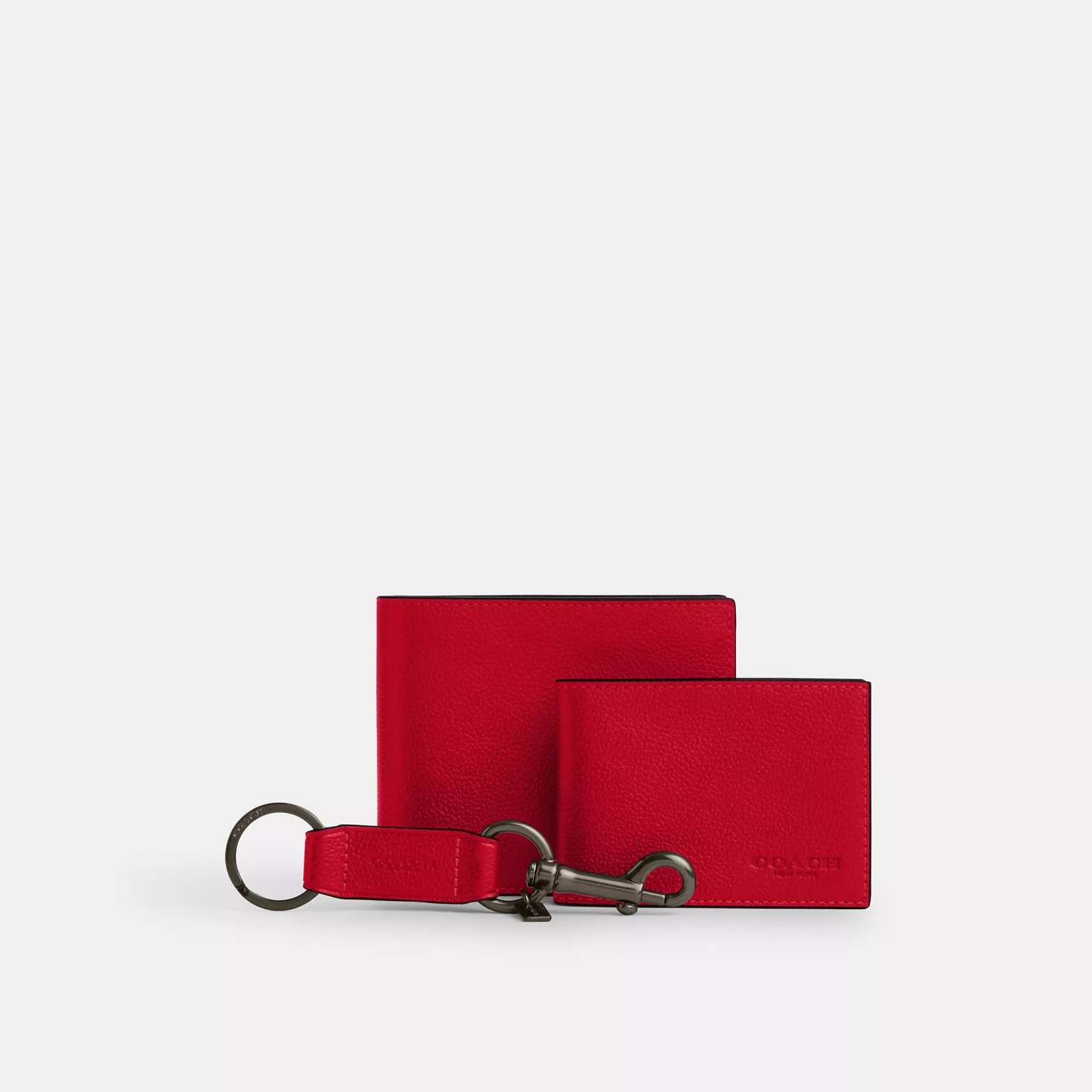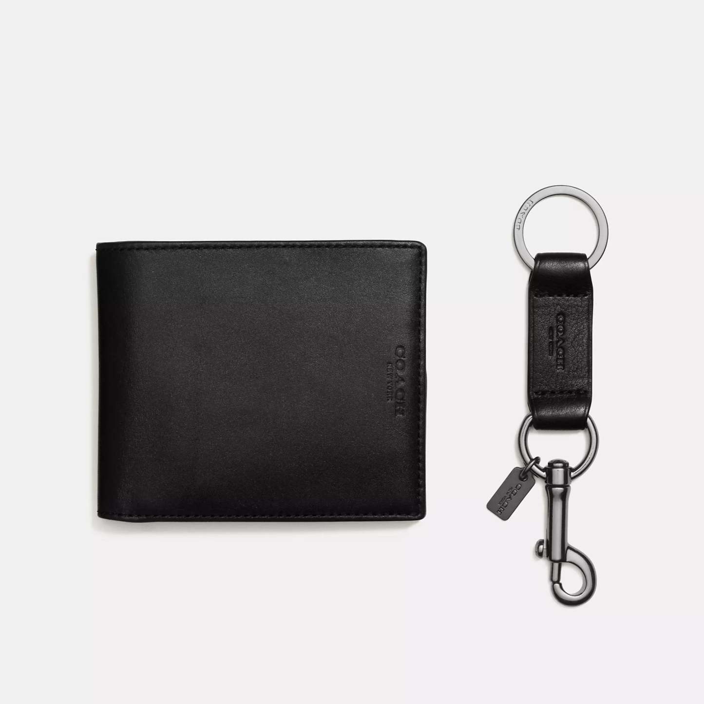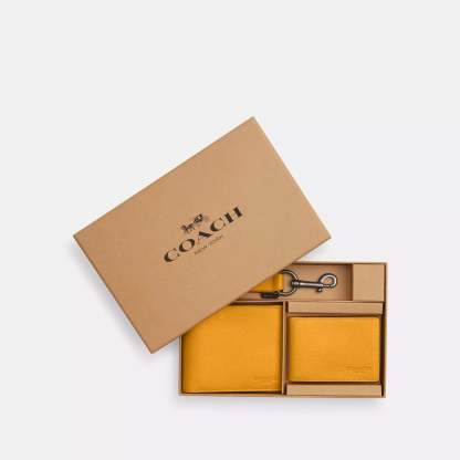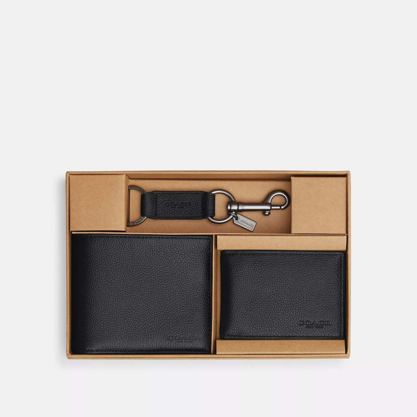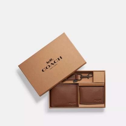 Smooth calf leather Eight credit card slots Full-length bill compartments Removable insert with ID window and two credit card slots 4 1/2 (L) x 3 3/4 (H) x 1 (W) Trigger valet key fob included Packaged in a Coach gift box Style No. CS433 | Coach Outlet Boxed 3 In 1 Wallet Gift Set - Black