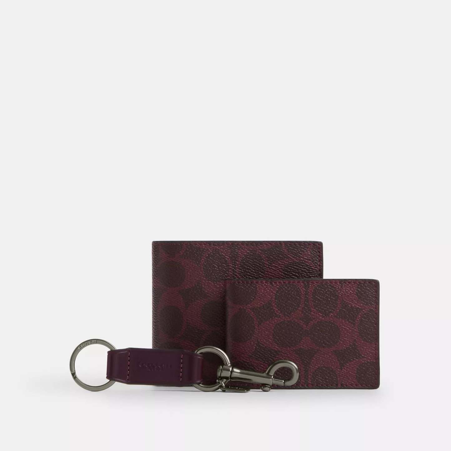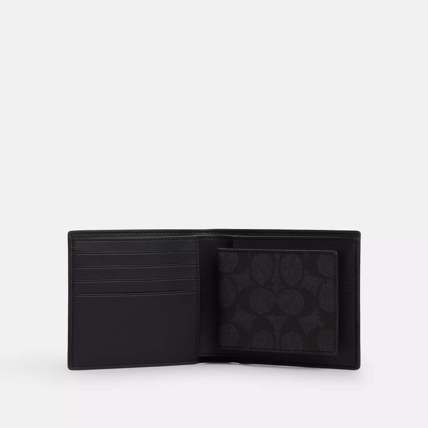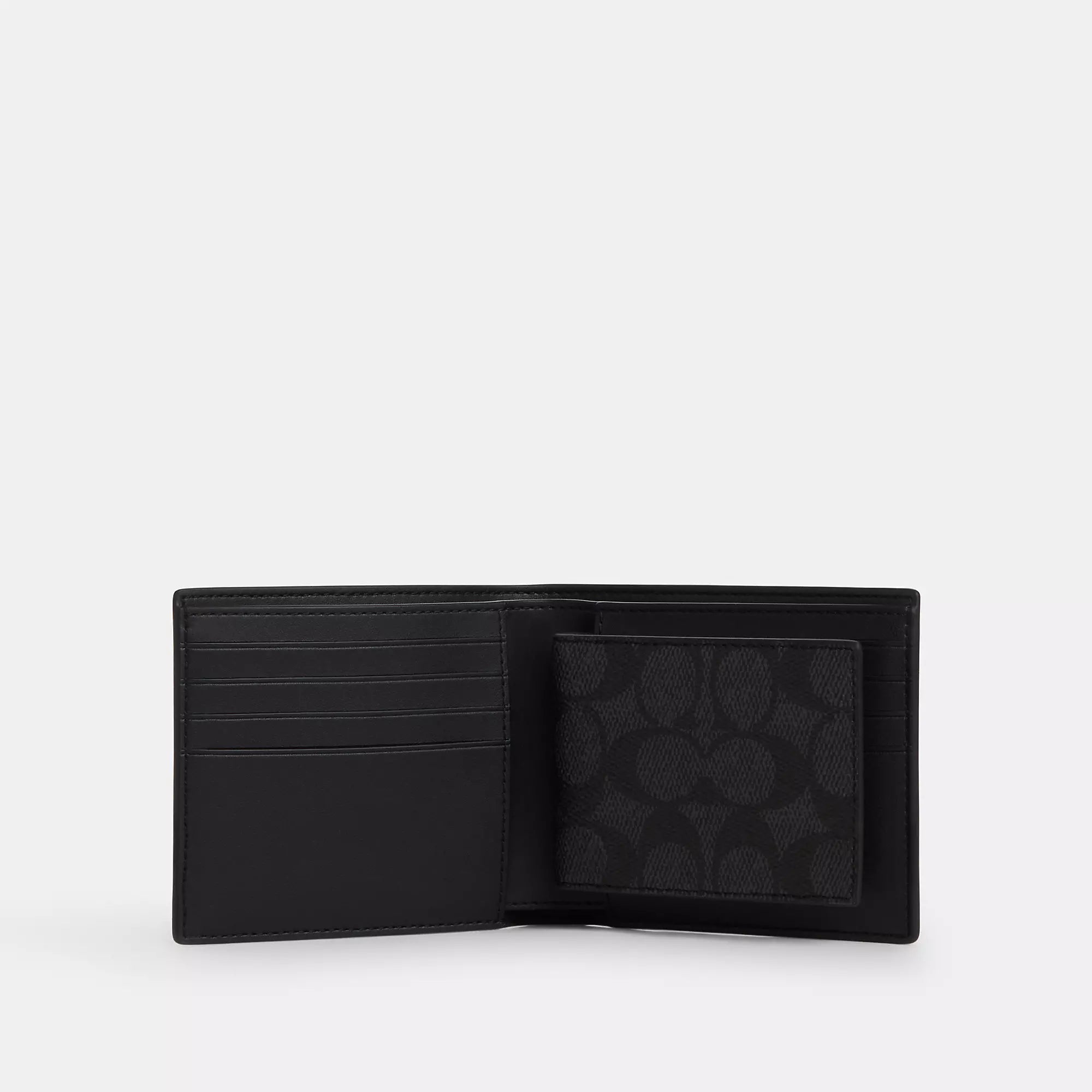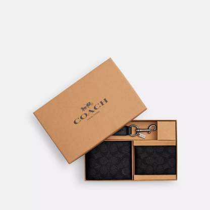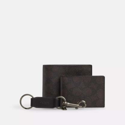 Signature coated canvas and refined calf leather Eight credit card slots Full-length bill compartments Removable insert with ID window and two credit card slots 4 1/2 (L) x 3 3/4 (H) x 1 (W) Trigger valet key fob included Packaged in a Coach gift box Style No. CW344 | Coach Outlet Boxed 3-In-1 Wallet Gift Set In Signature Canvas - Multi