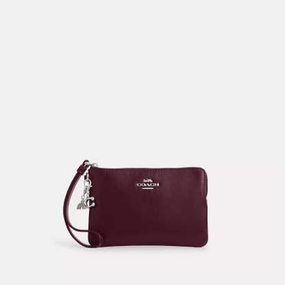 Shiny smooth leather Two credit card slots Zip-top closure fabric lining Wrist strap attached 6 1/4 (L) x 4 (H) x 1/2 (W) Includes removable charms Style No. CCK94 | Coach Outlet Boxed Corner Zip Wristlet With Charms - Red
