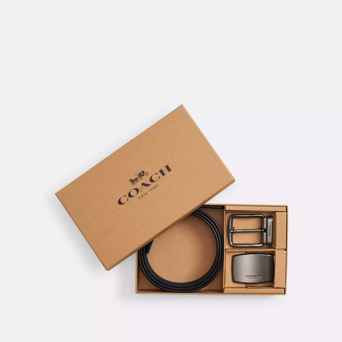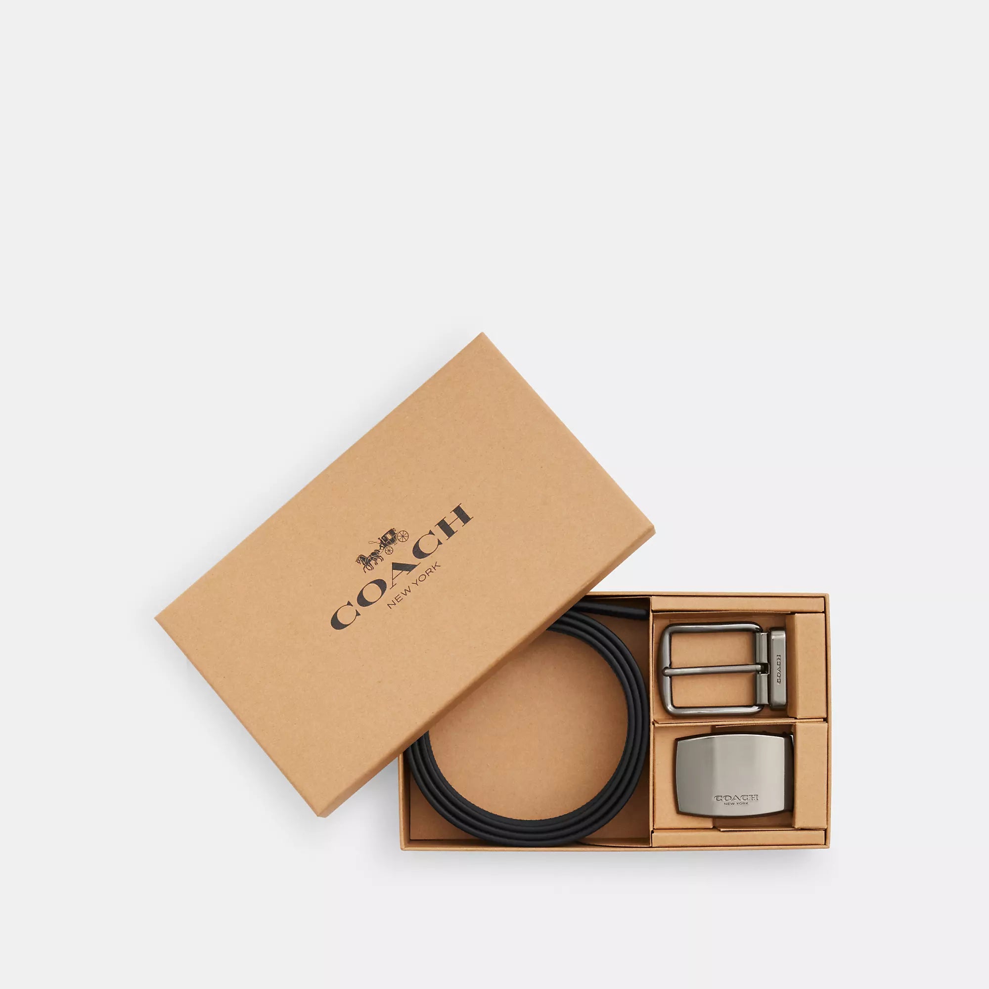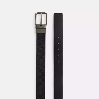 Signature coated canvas and refined calf leather Cut-to-size Reversible 38mm (W) Includes interchangeable buckles Packaged in a Coach gift box Style No. CW362 | Coach Outlet Boxed Plaque And Harness Buckle Cut To Size Reversible Belt, 38 Mm - Multi