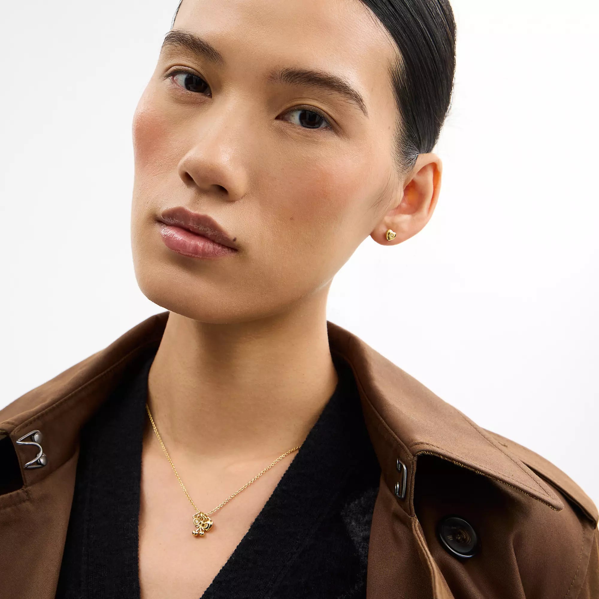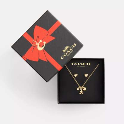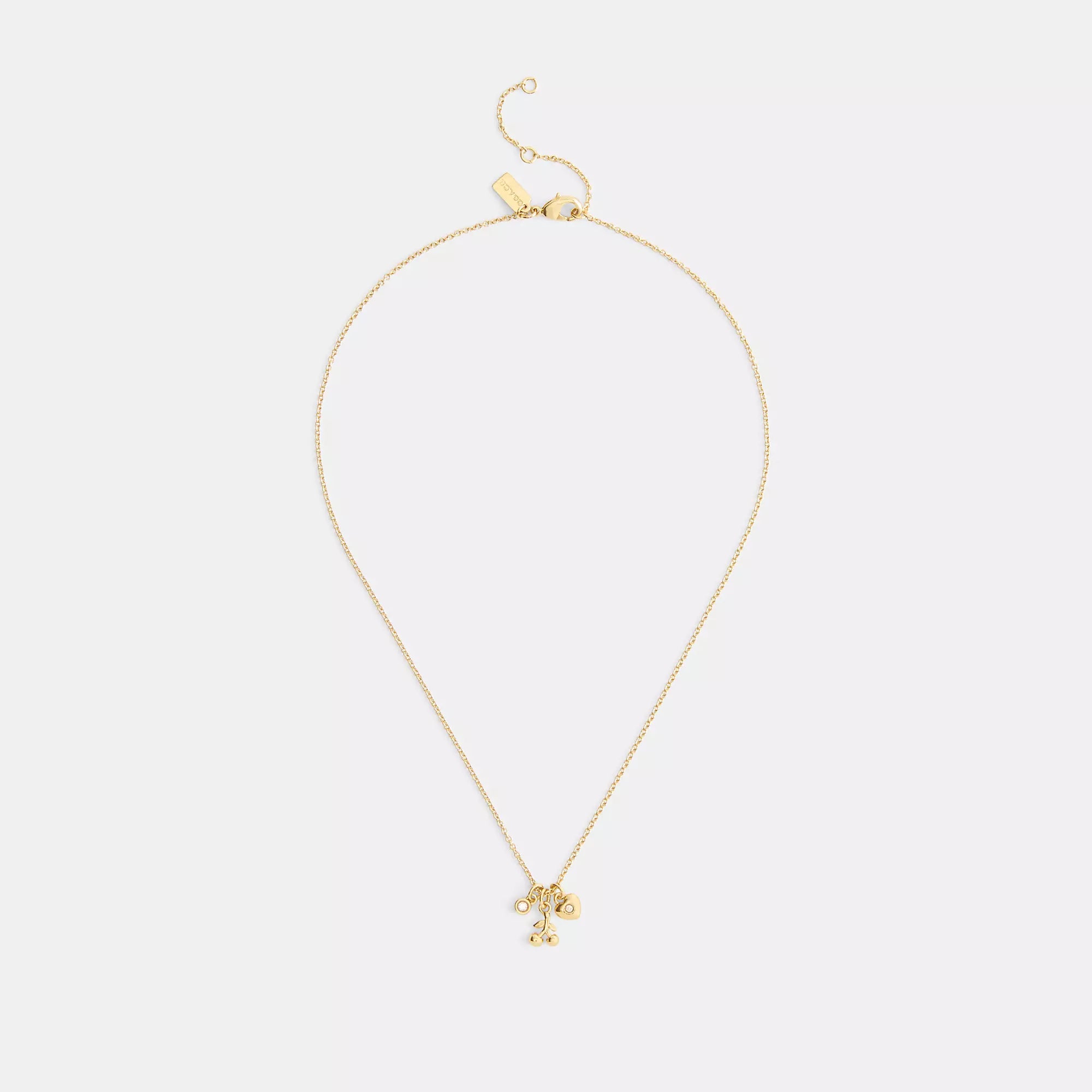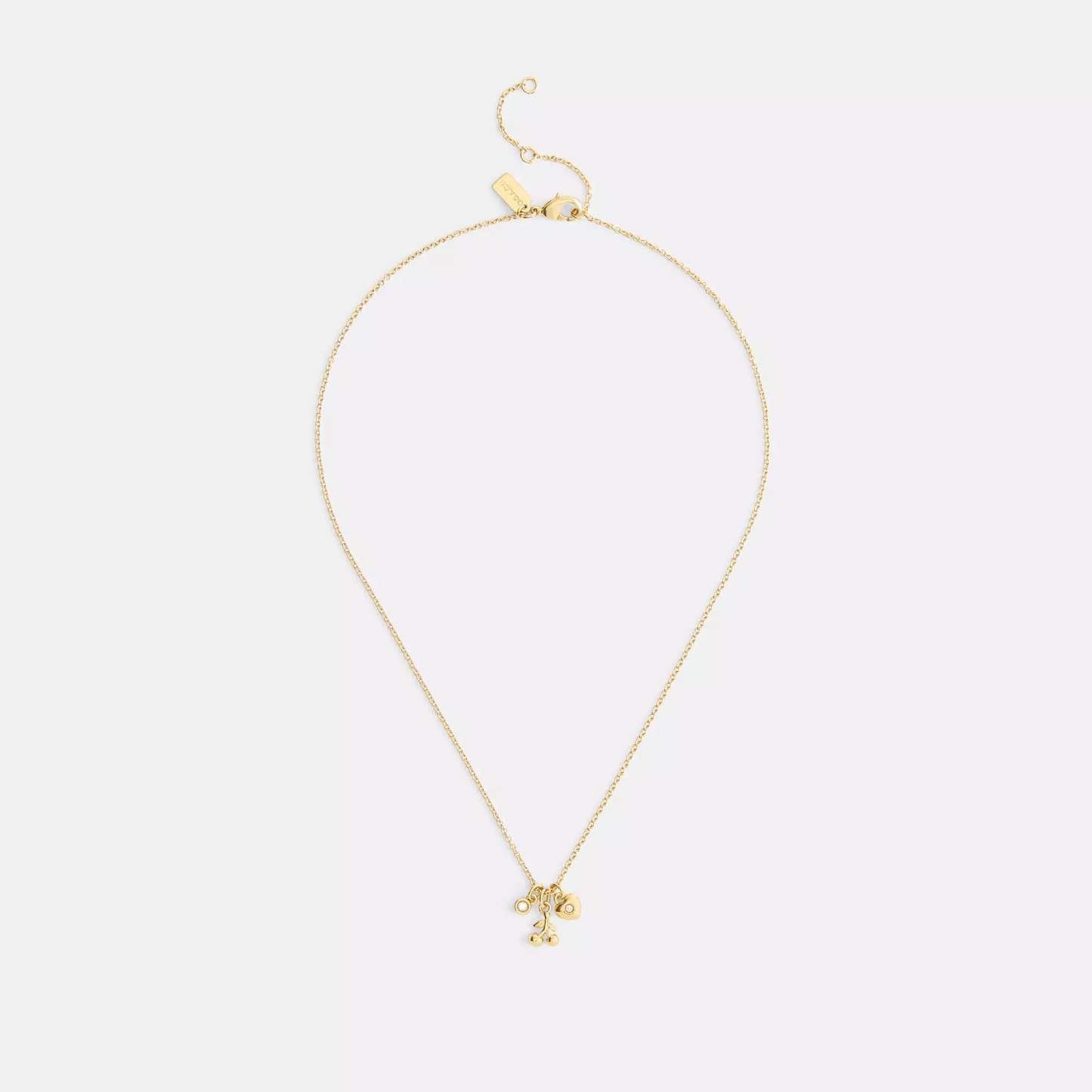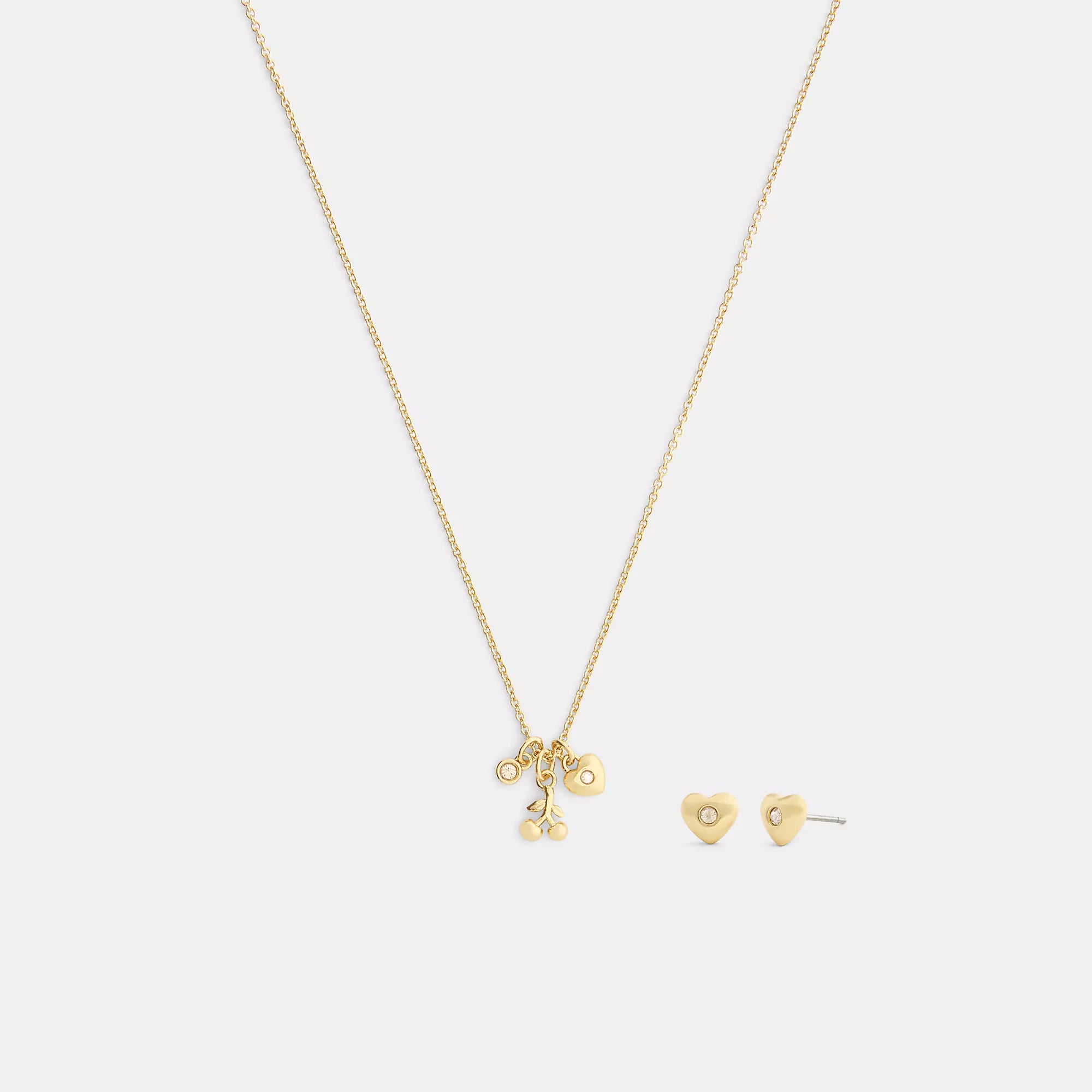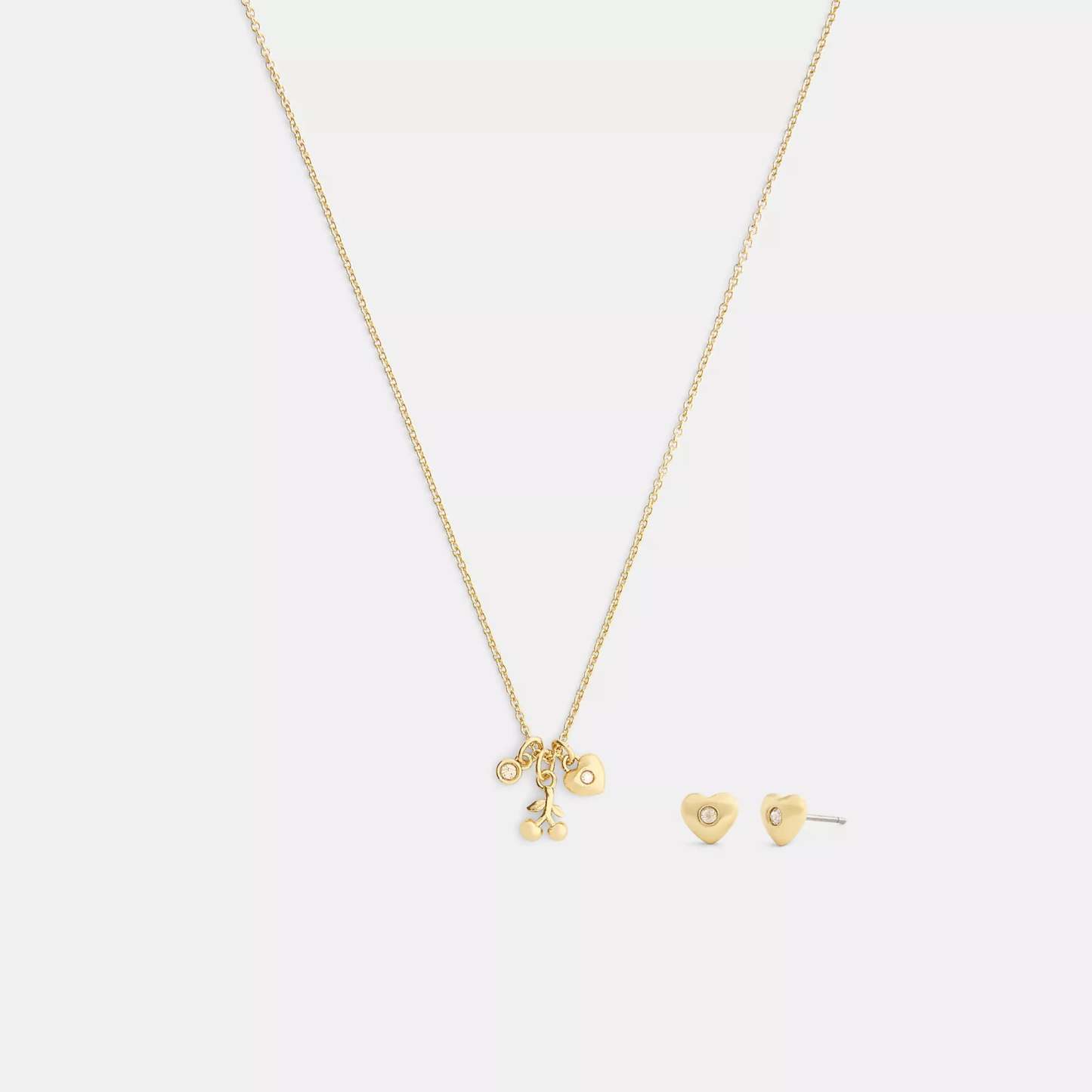 Necklace - Plated brass glass and cubic zirconia Lobster clasp closure Pendant - 1/4 (L) x 1/4 (H) Adjustable 16–18 (L) Earrings - Plated brass glass and cubic zirconia Hypoallergenic titanium post Butterfly clutch closure 1/4 (L) x 1/4 (H) Set of two Style No. CCU45 | Coach Outlet Cherry And Heart Earrings And Necklace Set - Gold