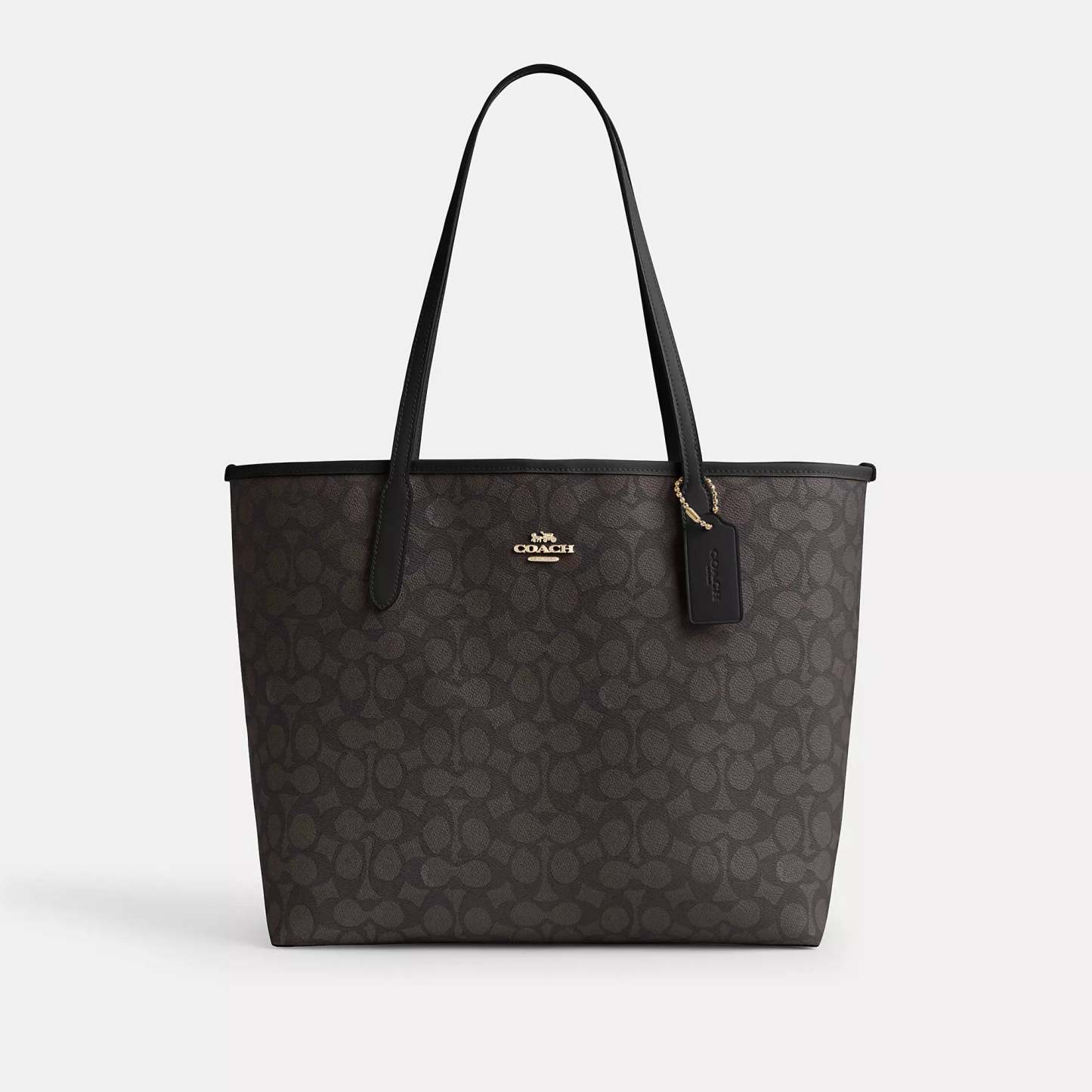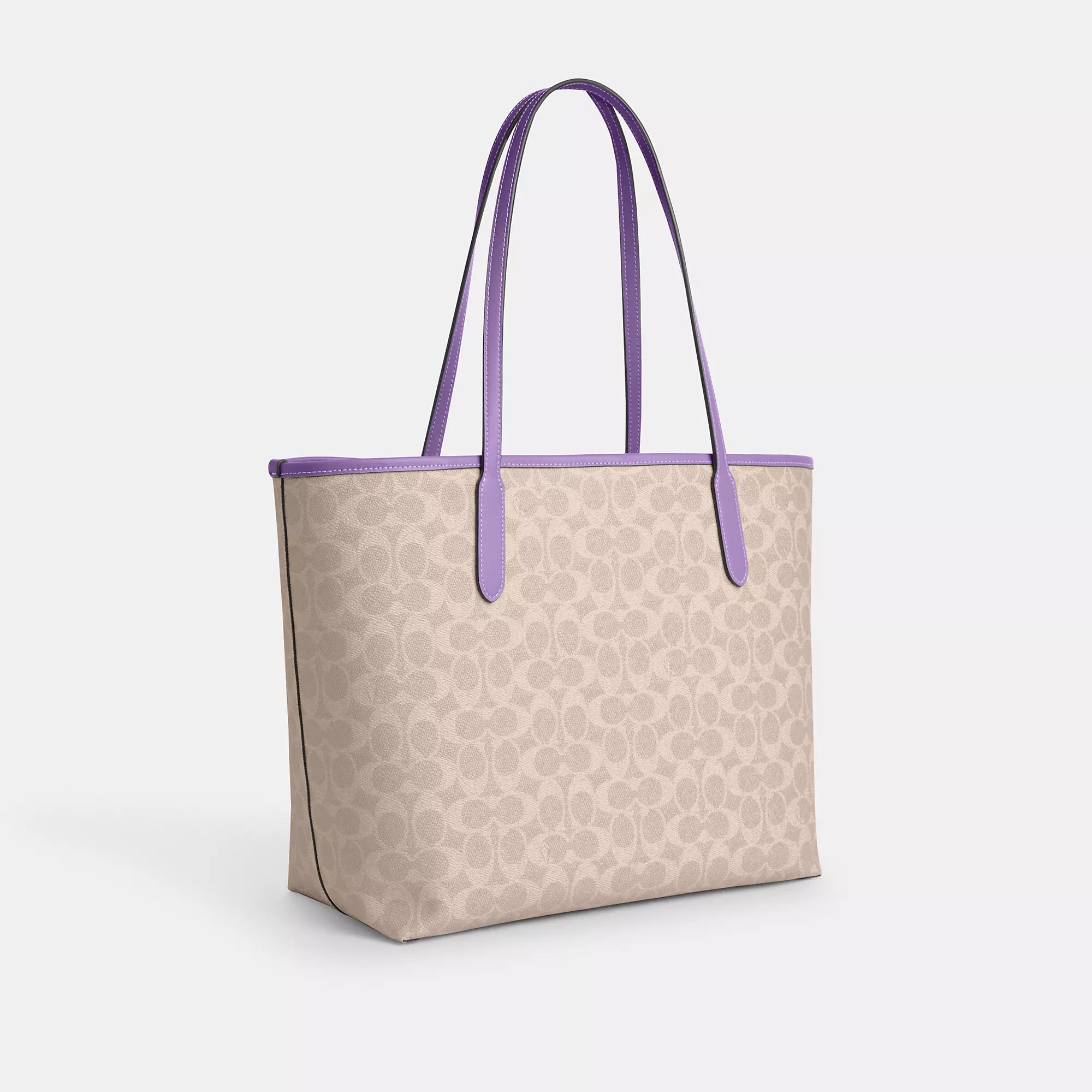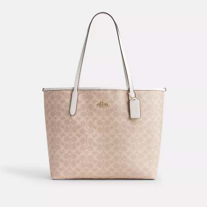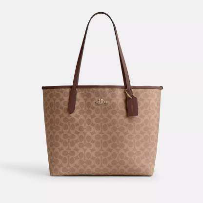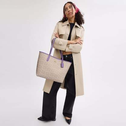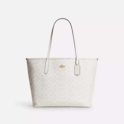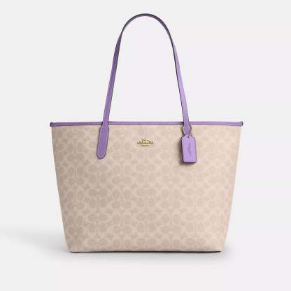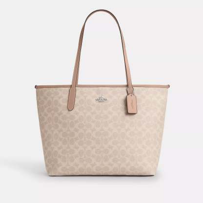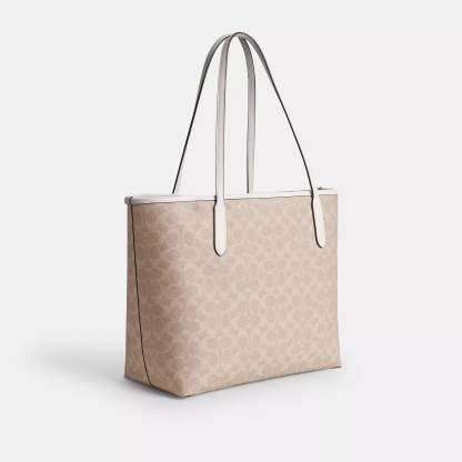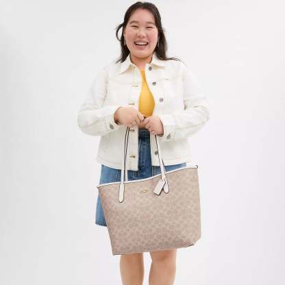Signature coated canvas Inside zip pocket Snap closure Handles with 10 drop 13 (L) x 11 1/2 (H) x 6 1/4 (W) Style No. CV976 | Coach Outlet City Tote Bag In Signature Canvas - Beige