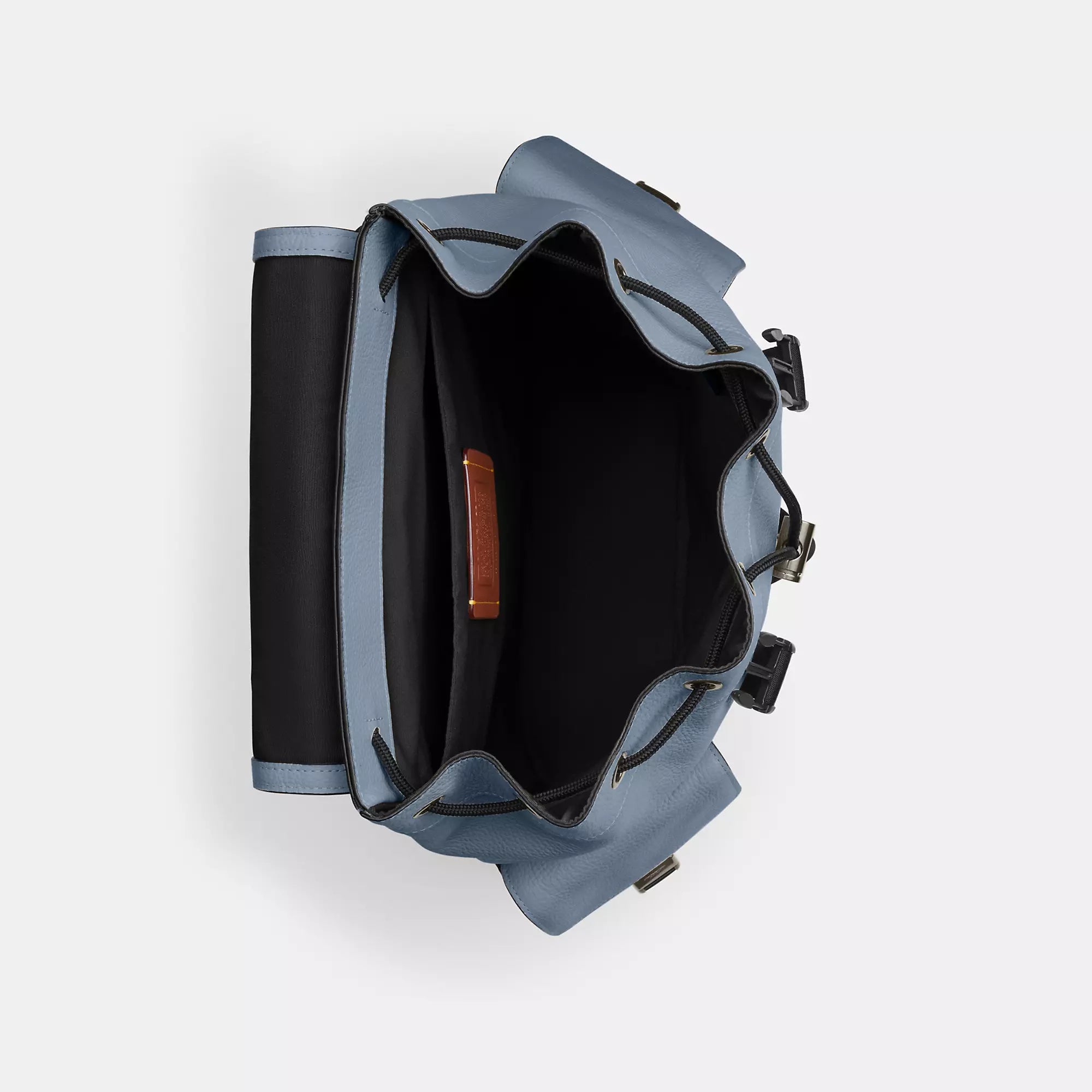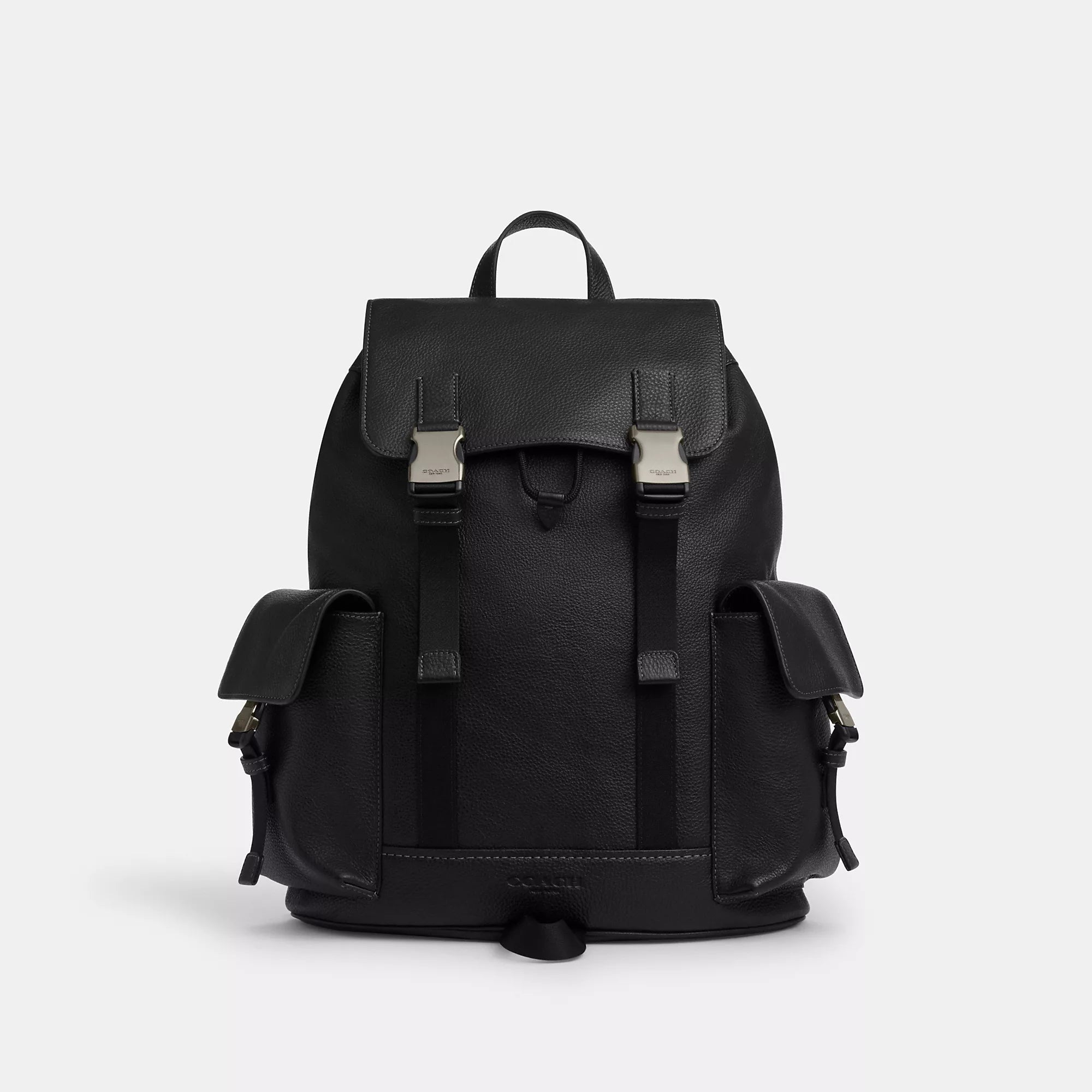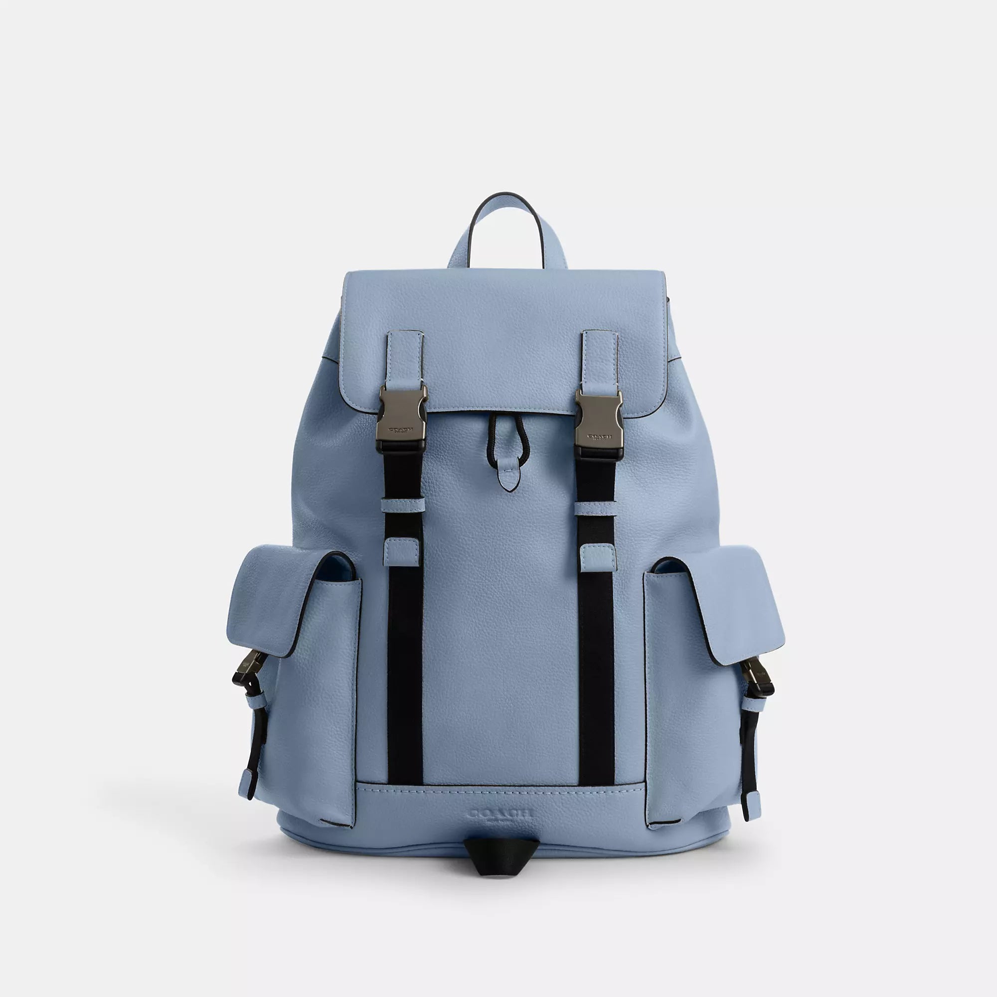Refined pebble leather Inside zip pocket Inside laptop sleeve Drawstring and speedclip closures fabric lining Handle with 3 1/2 drop Outside speedclip pockets Luggage sleeve Adjustable shoulder straps 13 (L) x 16 1/4 (H) x 4 1/2 (W) Style No. CCF89 | Coach Outlet Clark Backpack - Blue