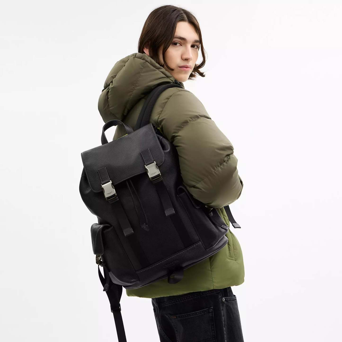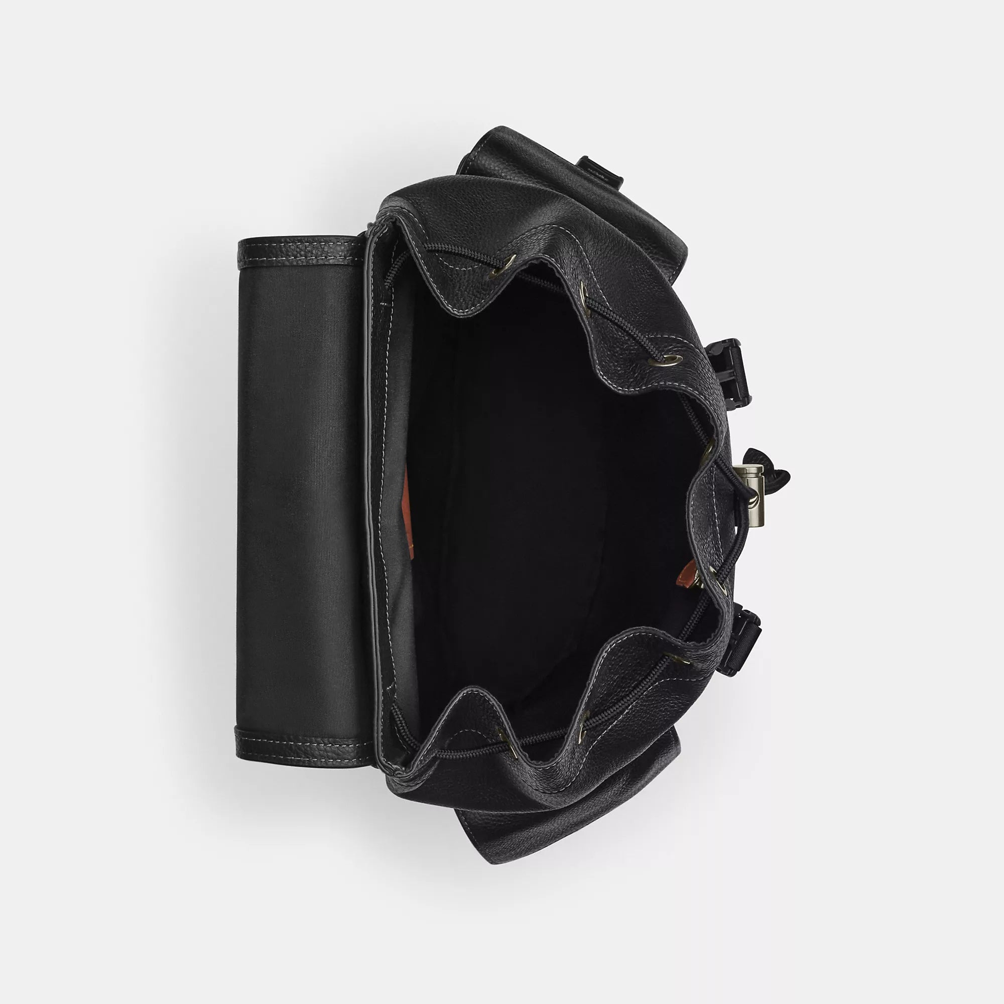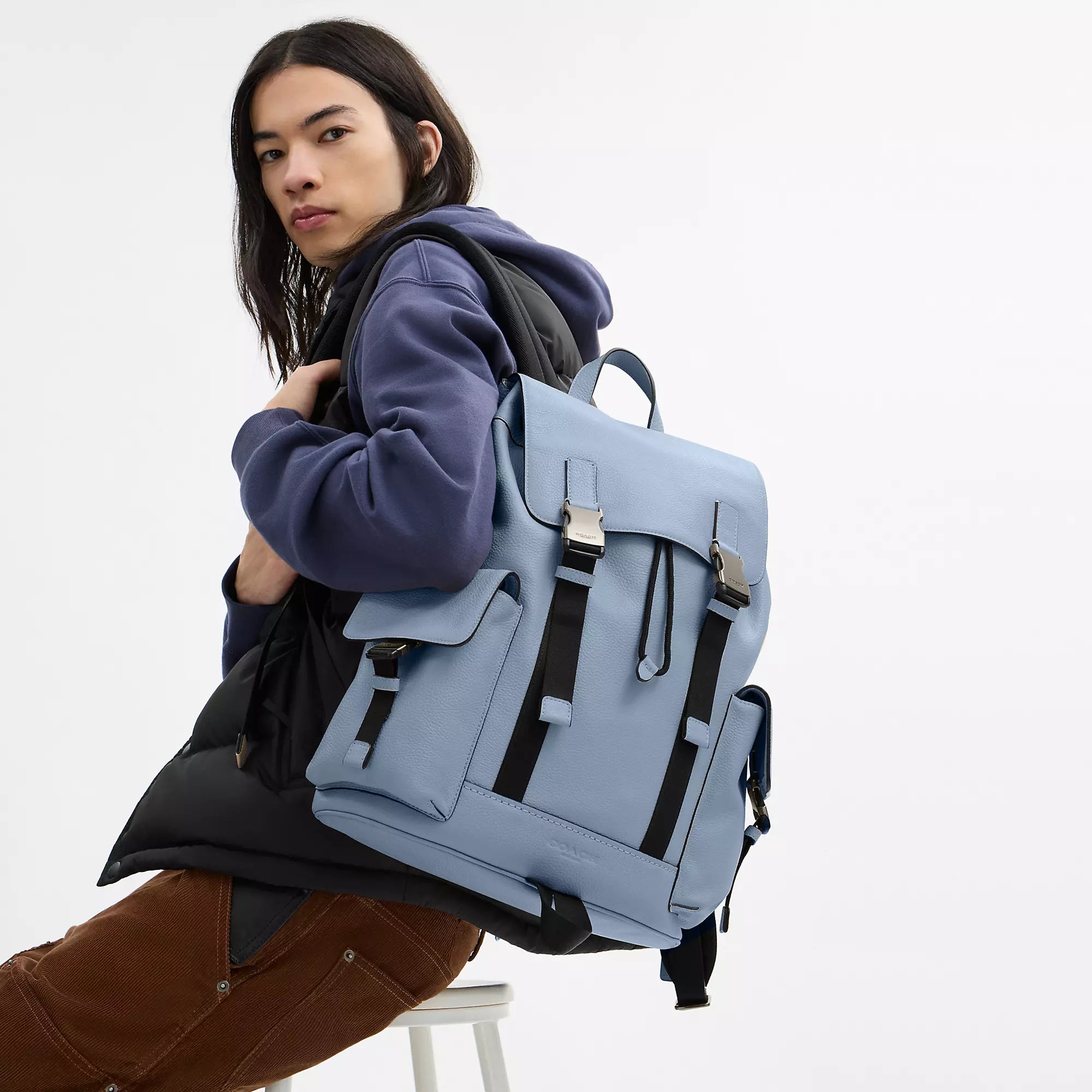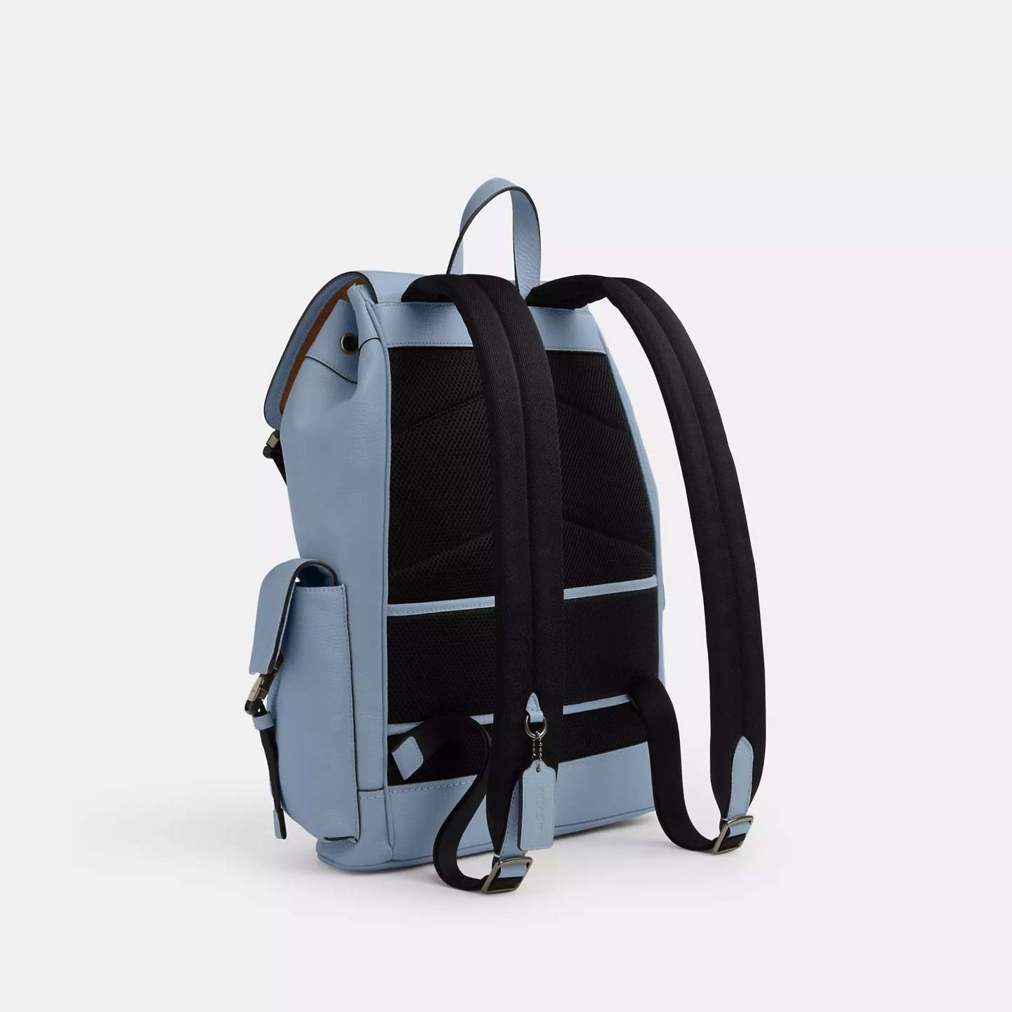 Refined pebble leather Inside zip pocket Inside laptop sleeve Drawstring and speedclip closures fabric lining Handle with 3 1/2 drop Outside speedclip pockets Luggage sleeve Adjustable shoulder straps 13 (L) x 16 1/4 (H) x 4 1/2 (W) Style No. CCF89 | Coach Outlet Clark Backpack - Blue