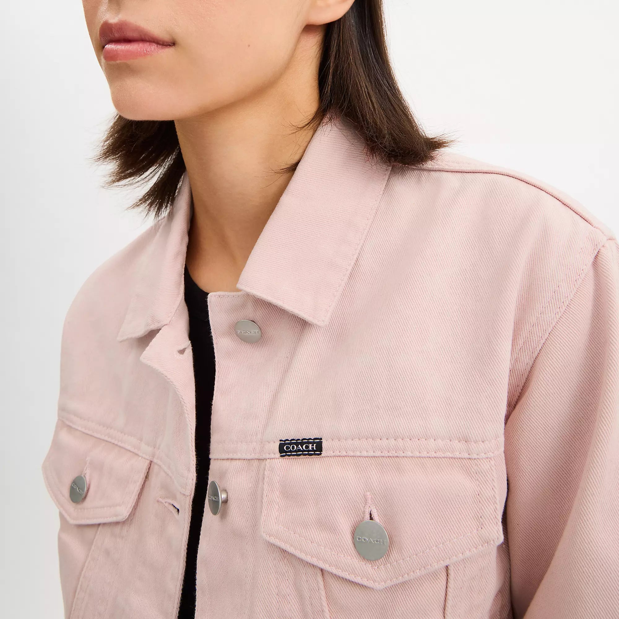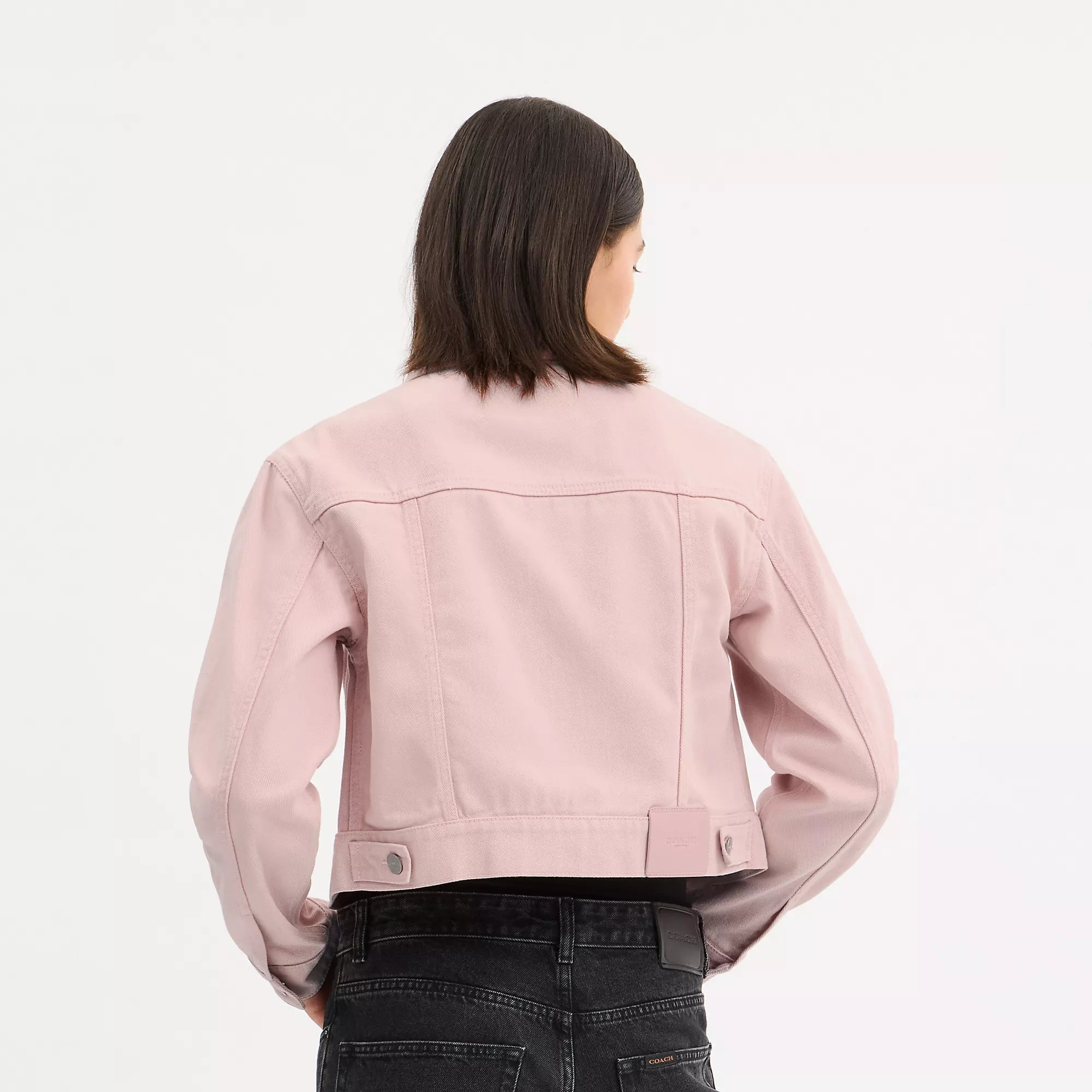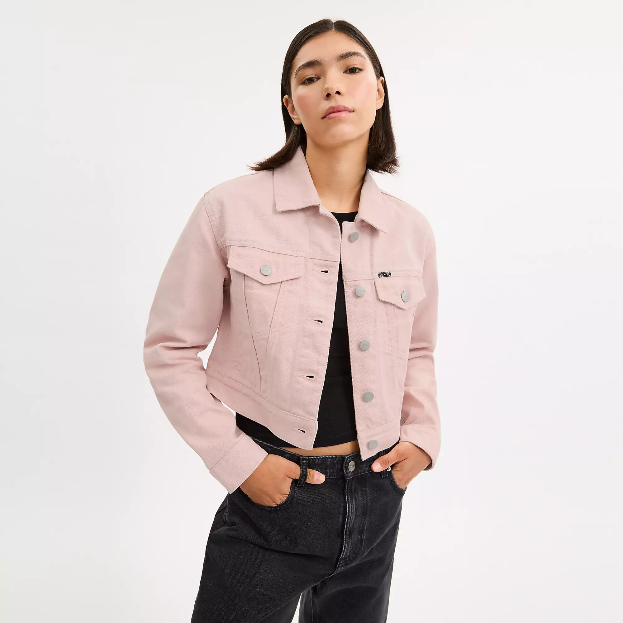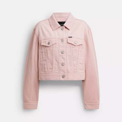 100% cotton Leather details Button closure Button pockets Length - 20 Machine wash Model is 5'10 (178cm) chest 31 (79cm) waist 24 (61cm) hips 35 (89cm) and wears a size S Style No. CBB95 | Coach Outlet Colorful Signature Denim Jacket - Pink, Size - Small