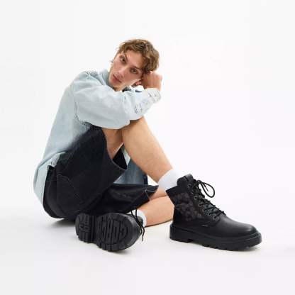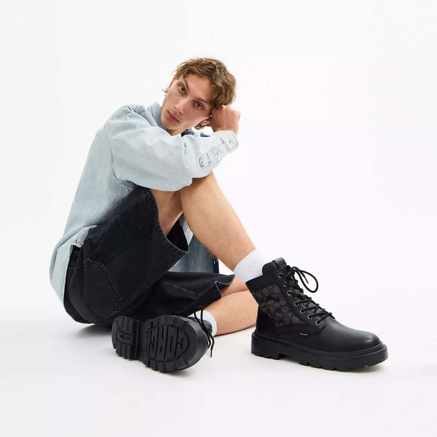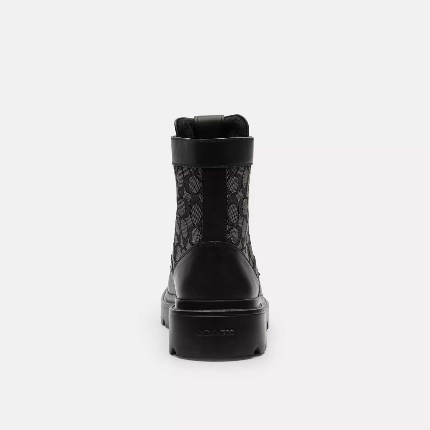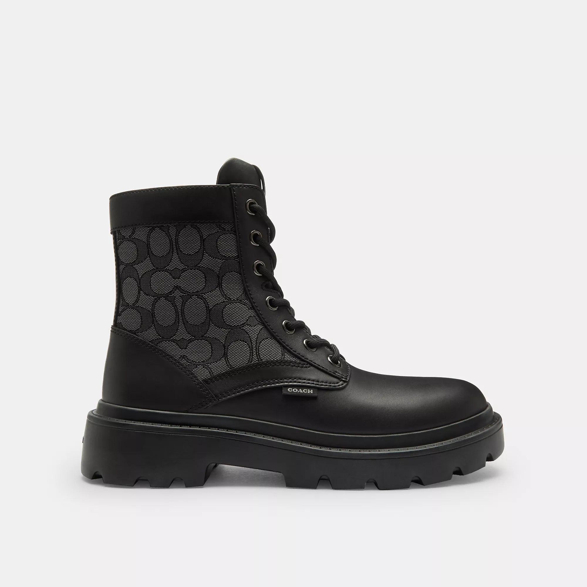 Leather and Signature jacquard upper Mesh and man-made leather lining and footbed EVA outsole Lace-up closure This Coach piece is crafted with our Signature jacquard made from a blend of regenerative cotton and recycled polyester Style No. CBN67 | Coach Outlet Combat Boot With Signature Jacquard - Grey, Size - 11.5