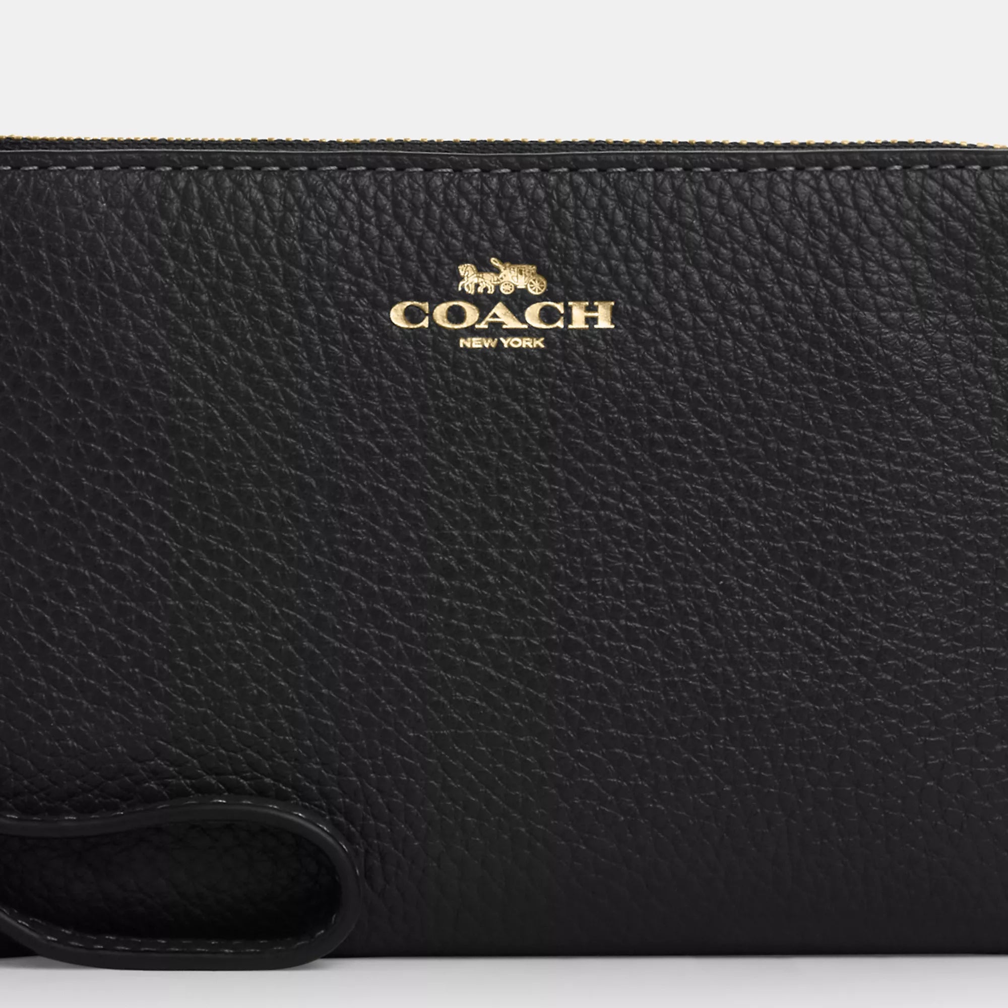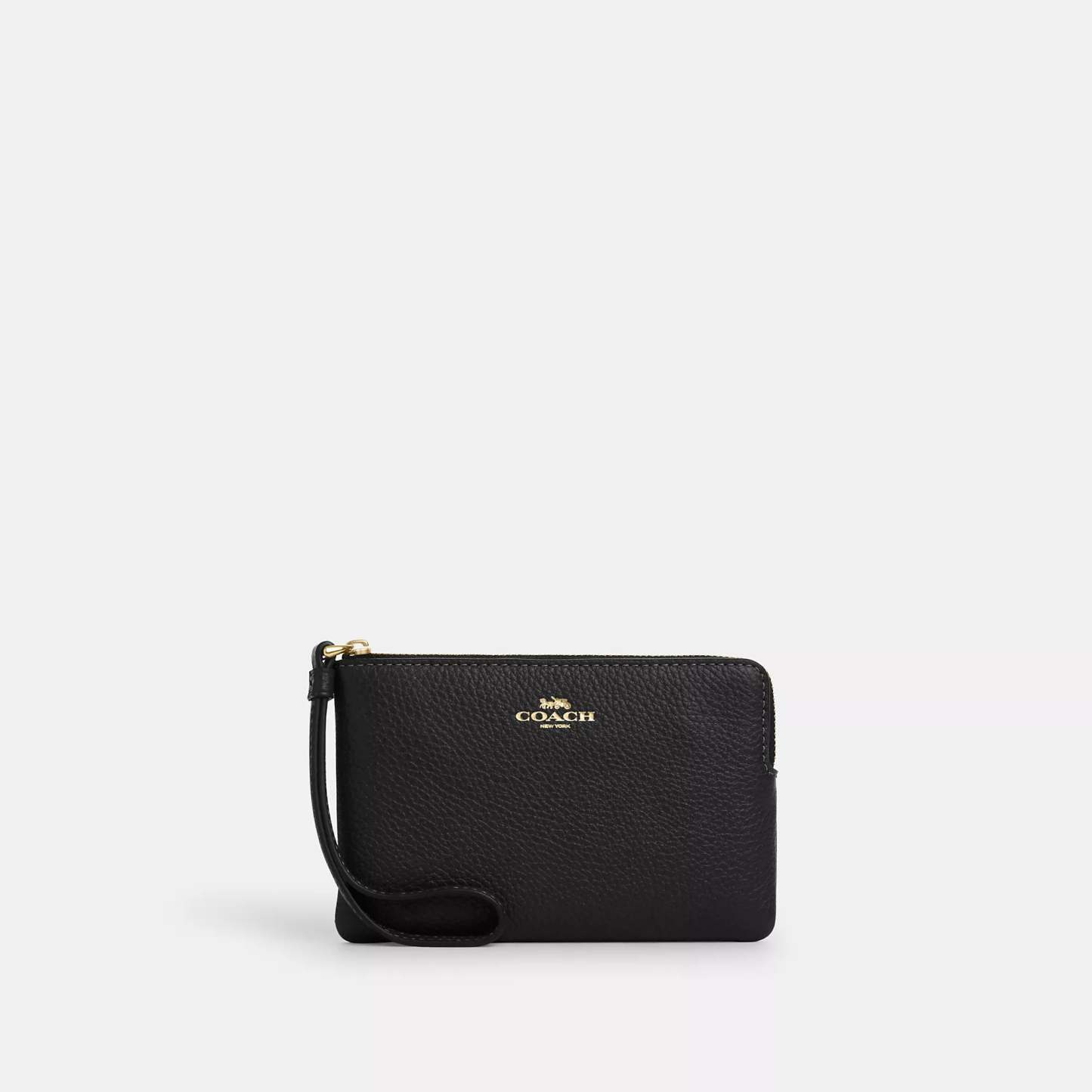 Refined pebble leather Two credit card slots Zip-top closure fabric lining Wrist strap attached 6 1/4 (L) x 4 (H) x 1/2 (W) Style No. CP483 | Coach Outlet Corner Zip Wristlet - Black