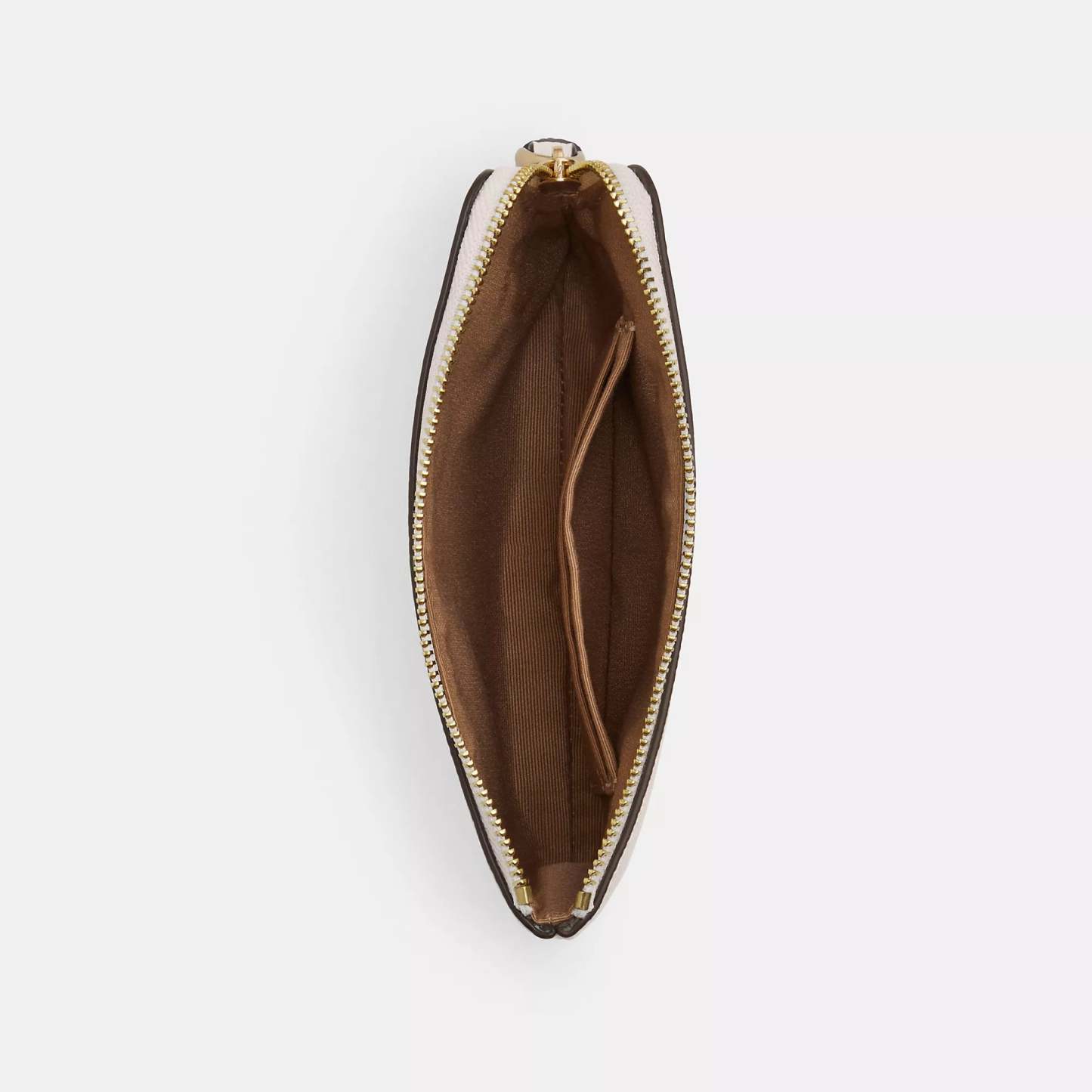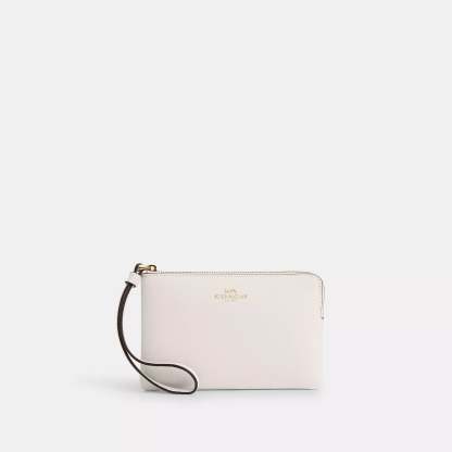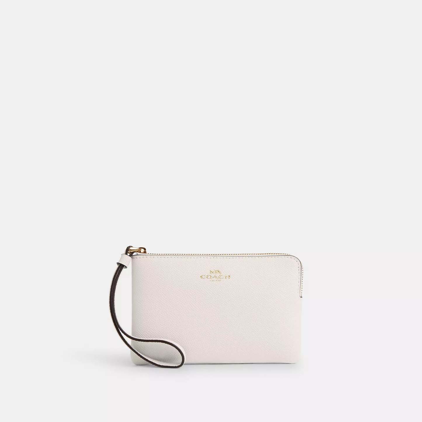 Shell partially made with recycled leather fiber layer Two credit card slots Zip-top closure fabric lining Wrist strap attached 6 1/4 (L) x 4 (H) x 1/2 (W) Style No. CV396 | Coach Outlet Corner Zip Wristlet - White