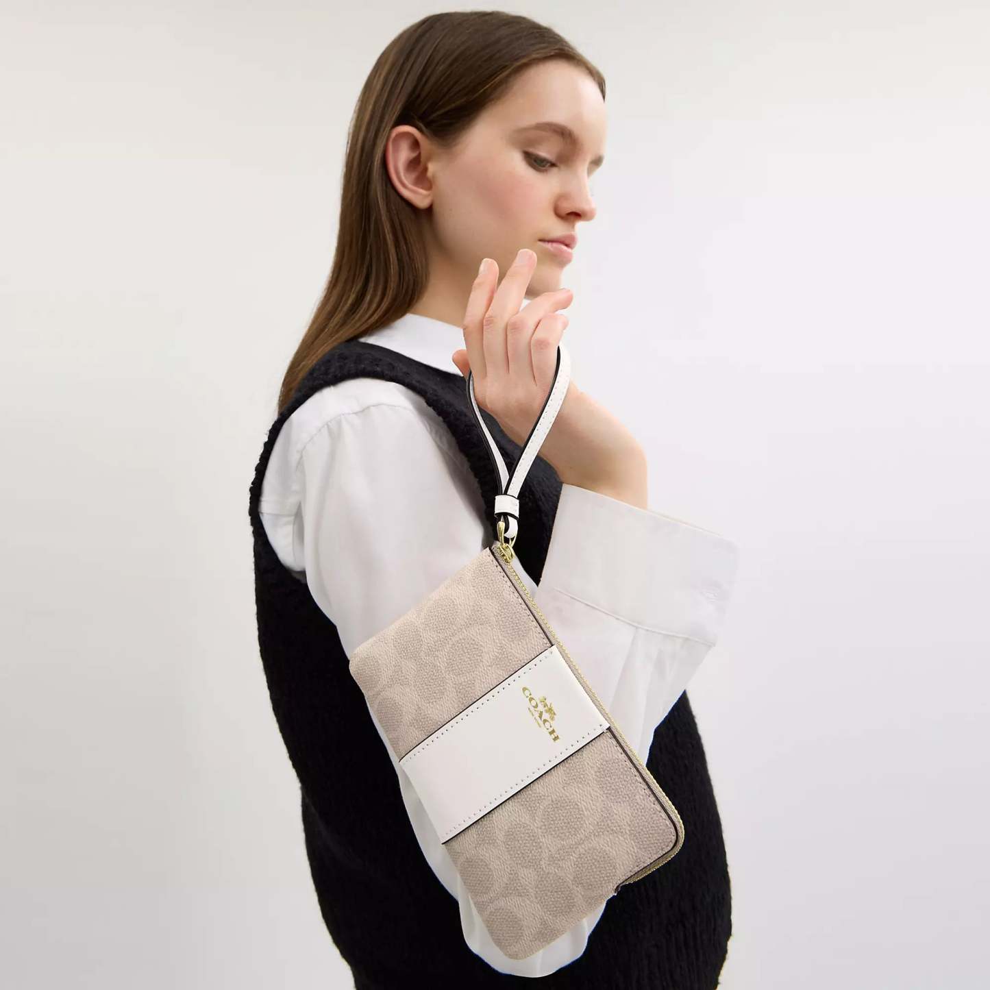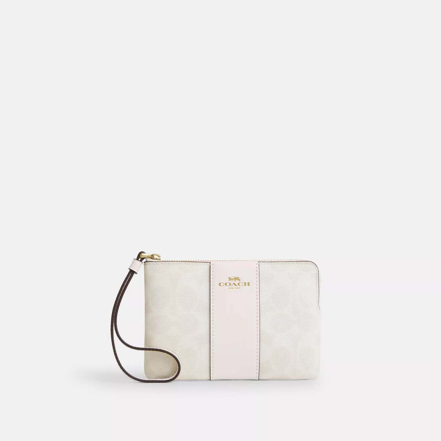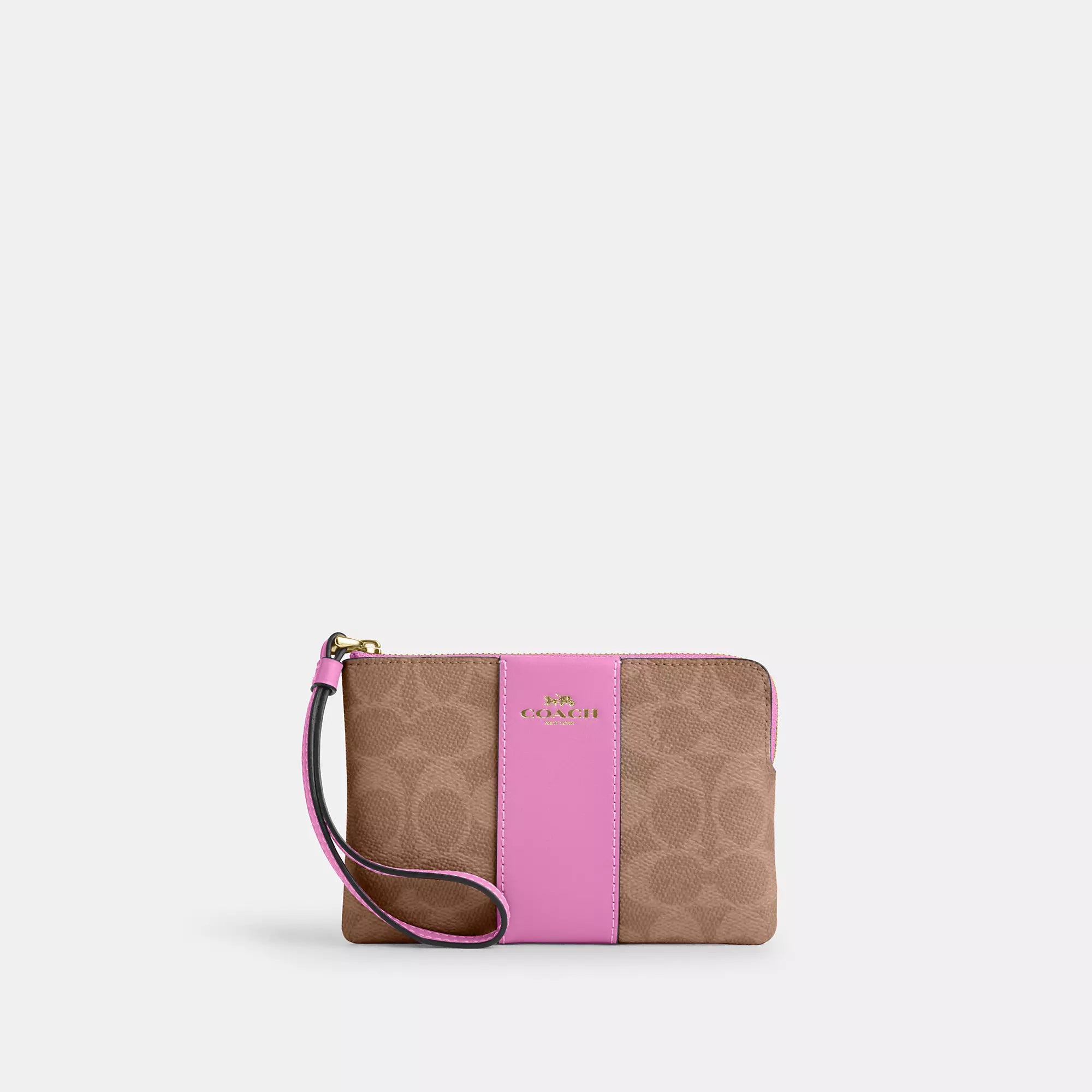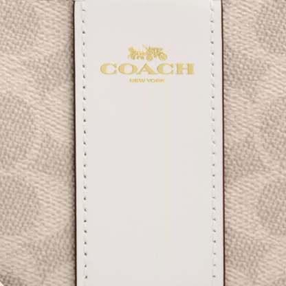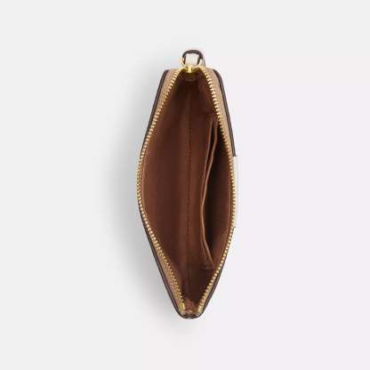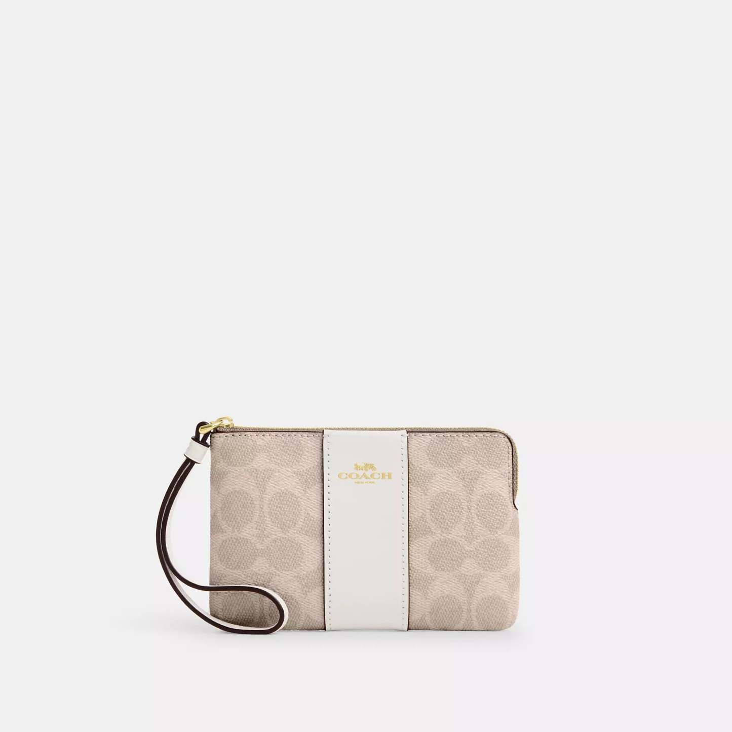 Signature coated canvas and smooth leather Two credit card slots Zip-top closure fabric lining Wrist strap attached 6 1/4 (L) x 4 (H) x 1/2 (W) Style No. CW854 | Coach Outlet Corner Zip Wristlet In Signature Canvas With Stripe - Beige
