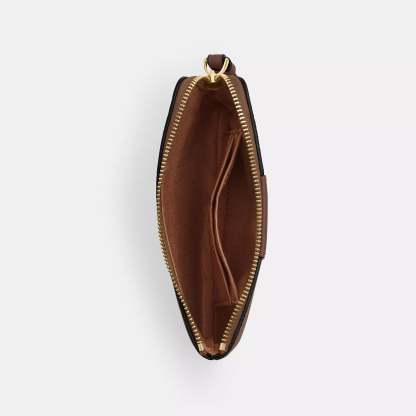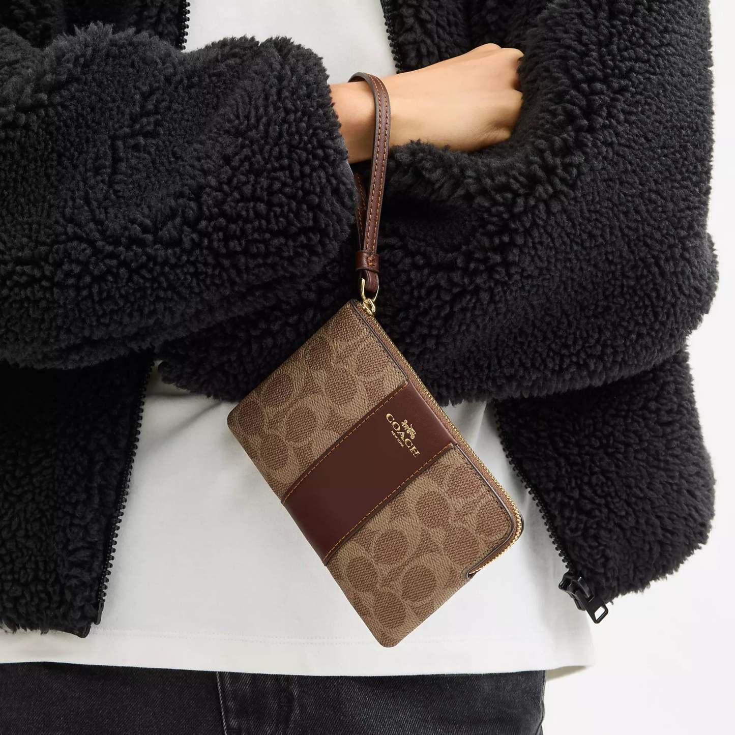 Signature coated canvas and smooth leather Two credit card slots Zip-top closure fabric lining Wrist strap attached 6 1/4 (L) x 4 (H) x 1/2 (W) Style No. CW854 | Coach Outlet Corner Zip Wristlet In Signature Canvas With Stripe - Brown