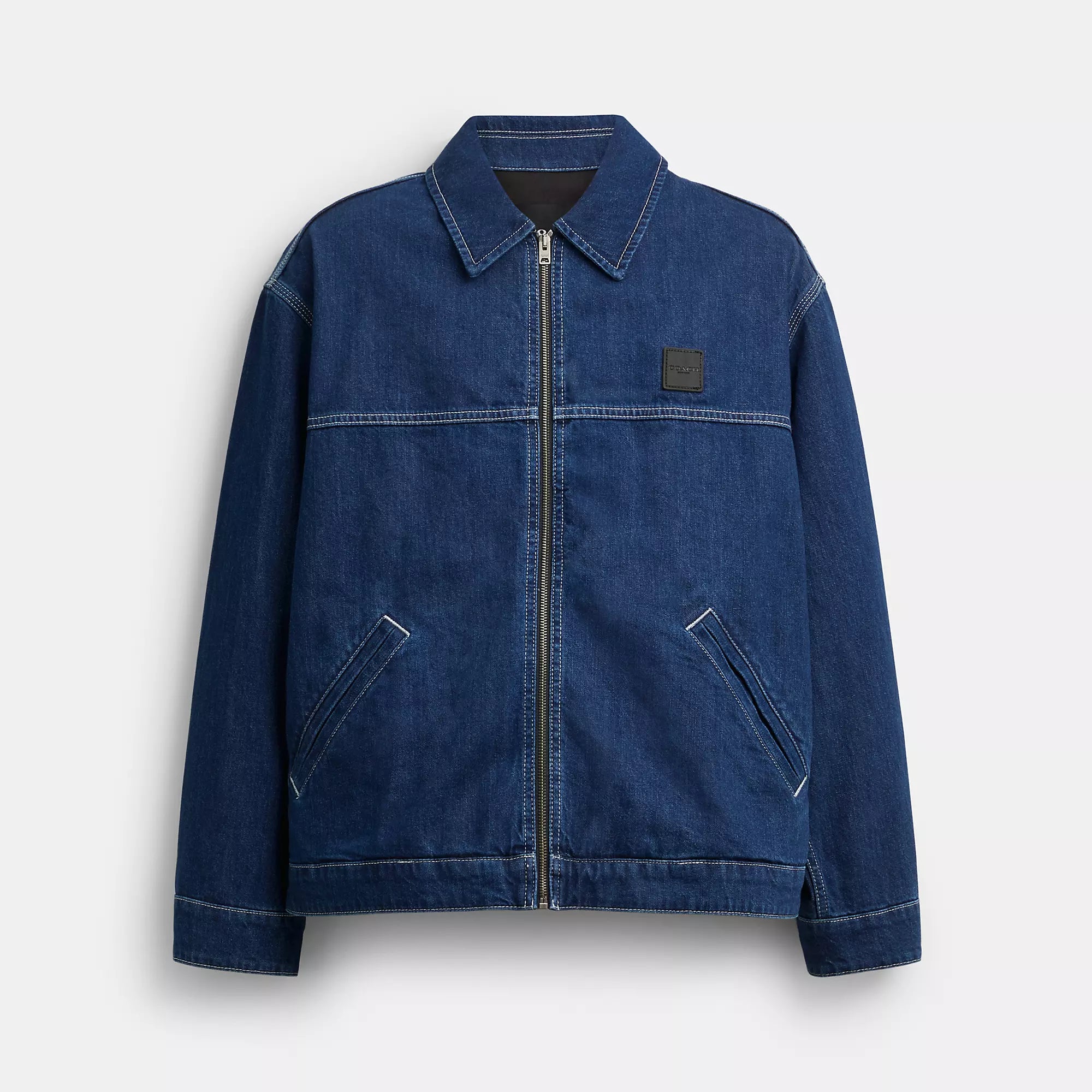 100% cotton Body lining - 65% polyester 35% cotton Sleeves lining - 56% polyester 44% viscose Leather details Zip closure Slip pockets Length - 27 Machine wash Model is 6'2 (188cm) and wears a size M Style No. CY414 | Coach Outlet Denim Work Jacket - Blue, Size - Medium