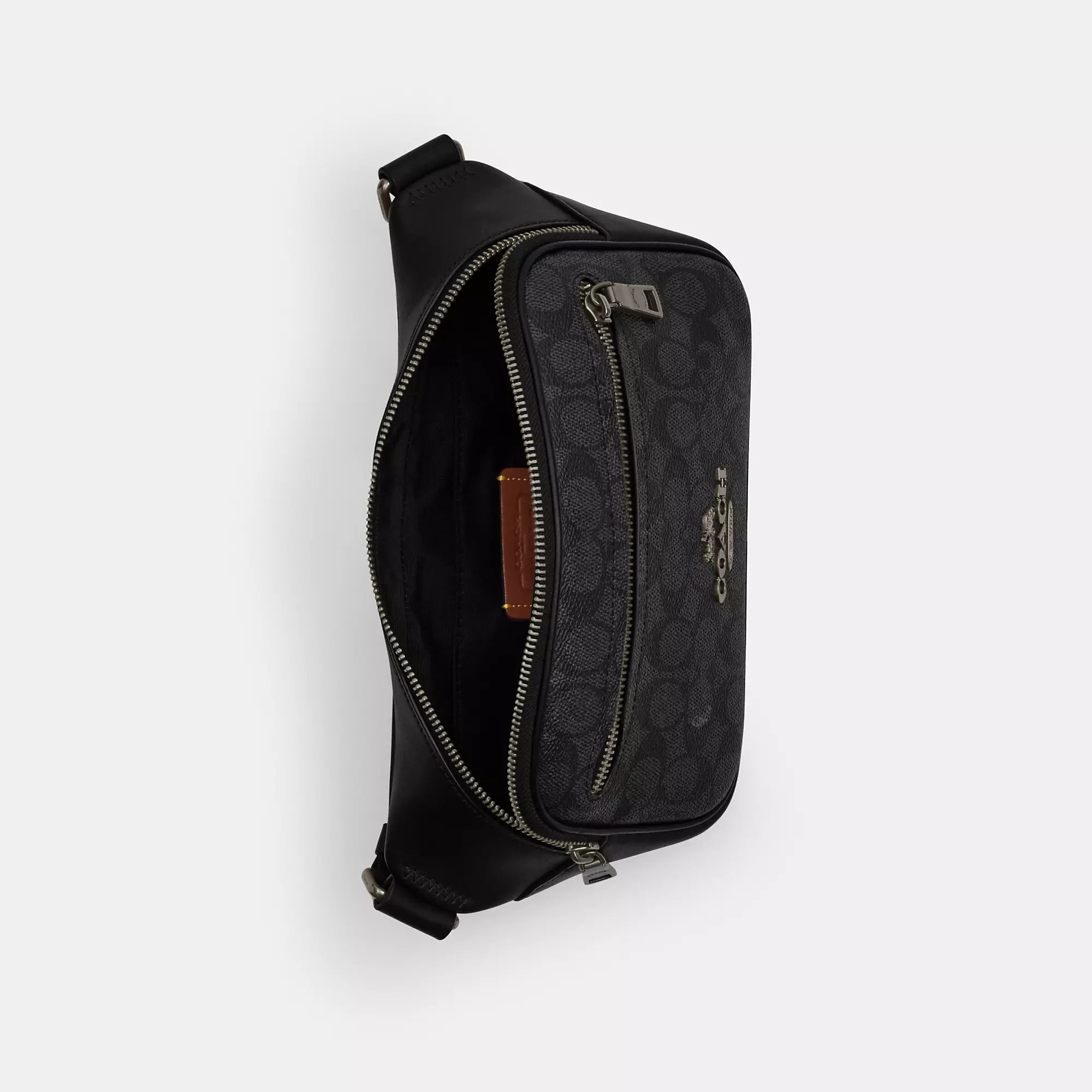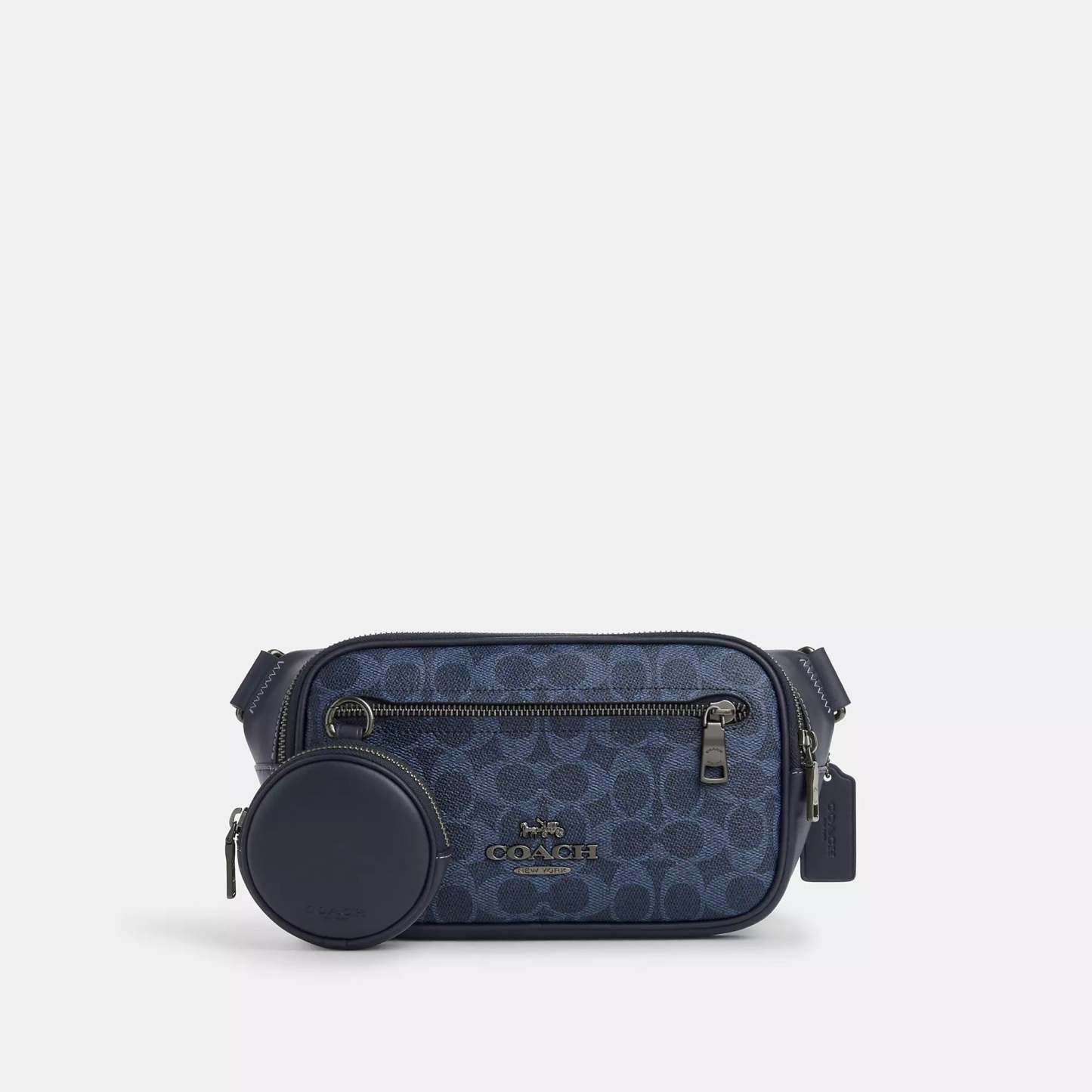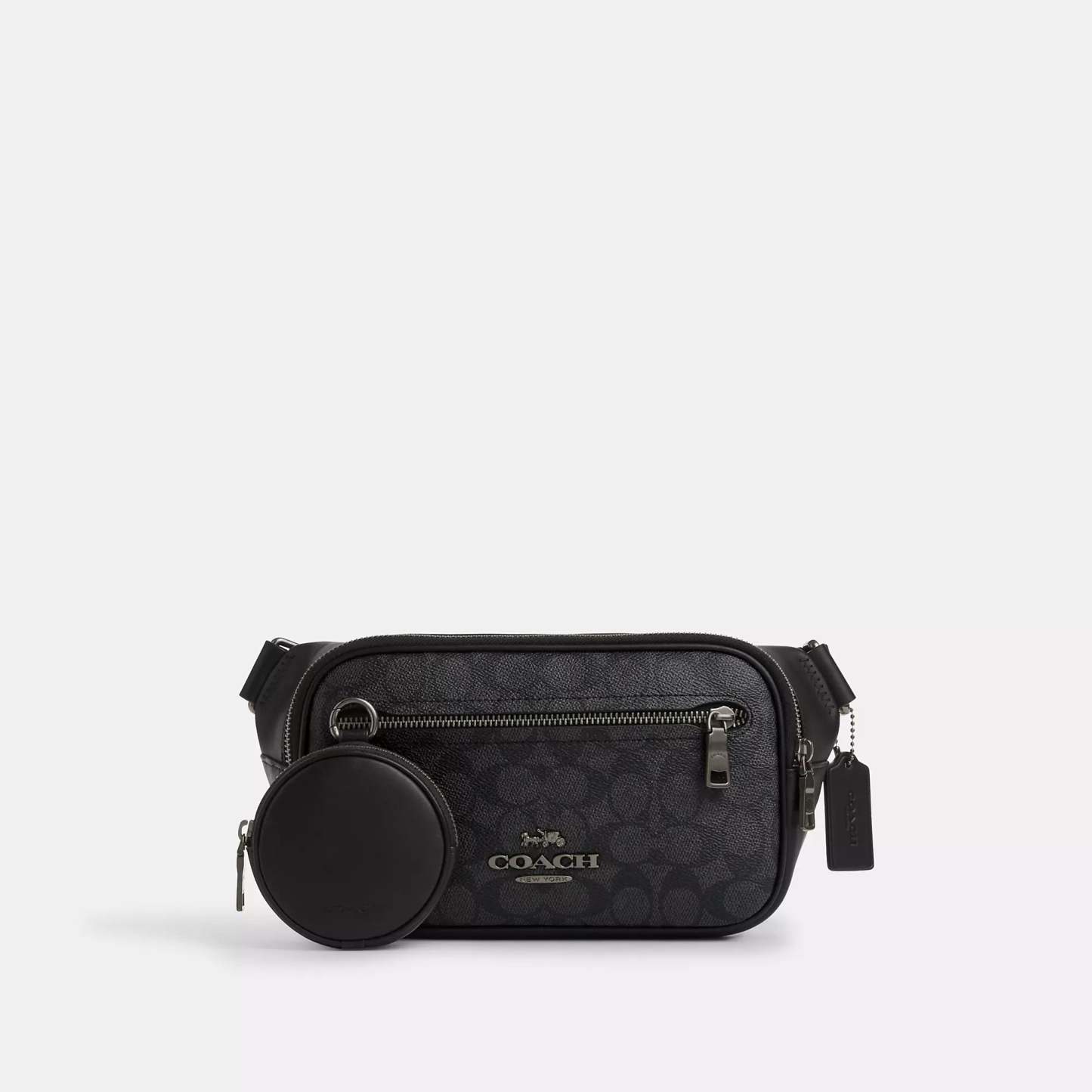 Signature coated canvas and smooth calf leather Belt bag - Inside multifunction pocket Zip closure fabric lining Outside zip pocket Adjustable strap with 48 length for wear at waist 11 1/4 (L) x 5 1/2 (H) x 2 1/4 (W) Removable round coin case - Zip closure fabric lining Attached hinged D-ring 3 1/2 (L) x 3 1/2 (W) x 1 (W) Style No. CZ400 | Coach Outlet Elias Belt Bag In Signature Canvas - Multi