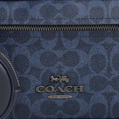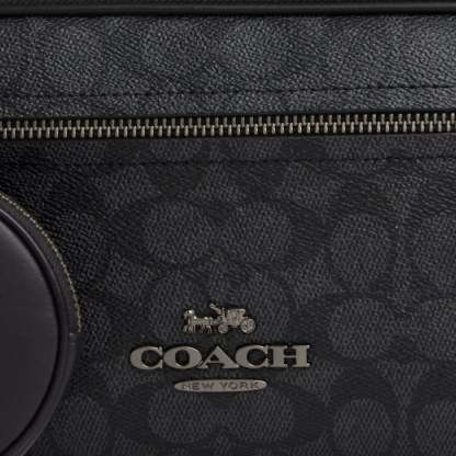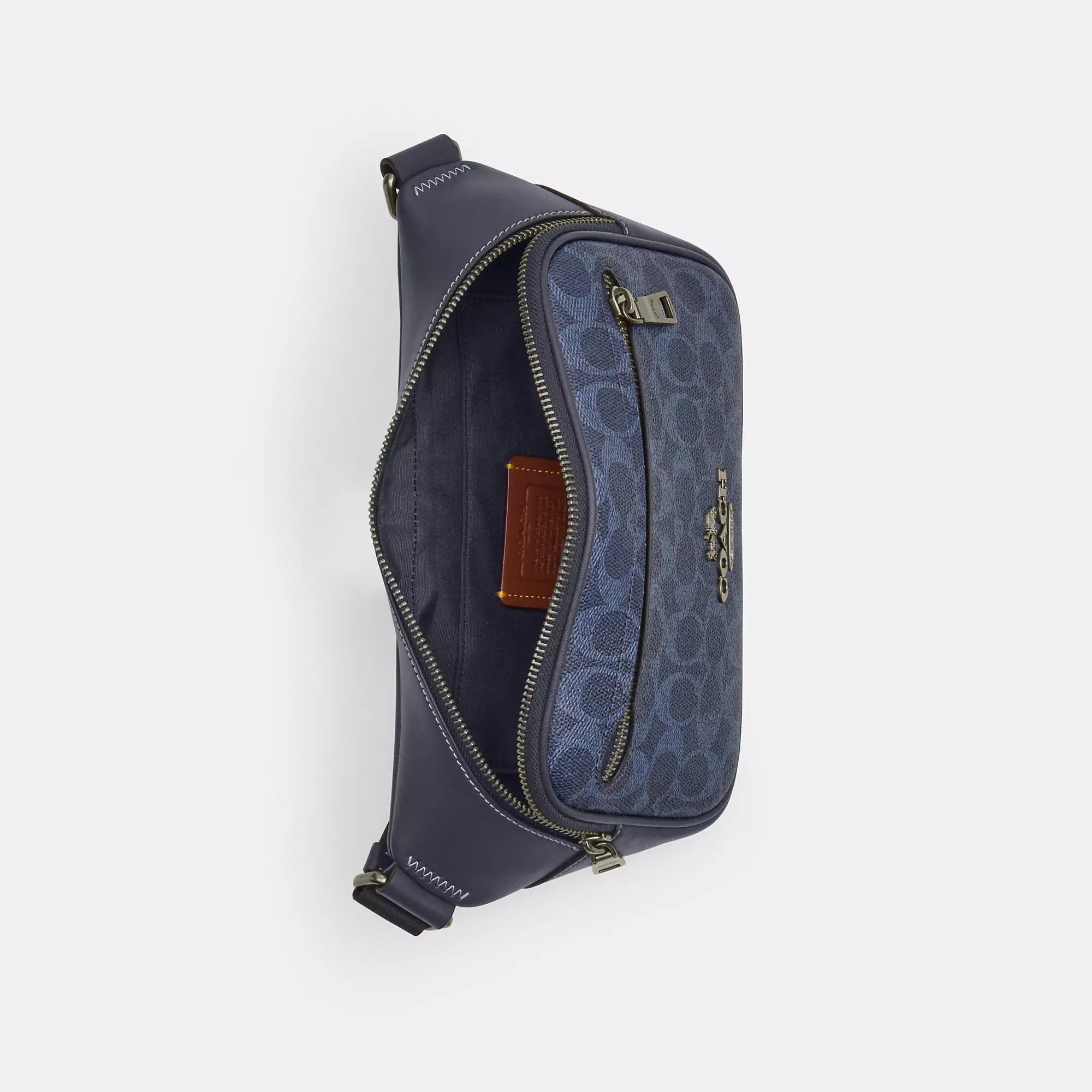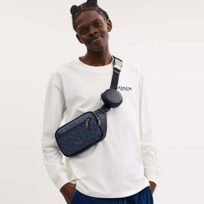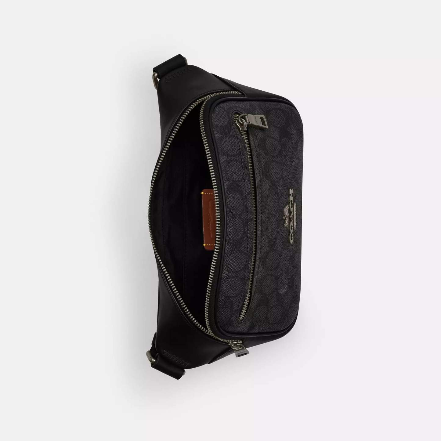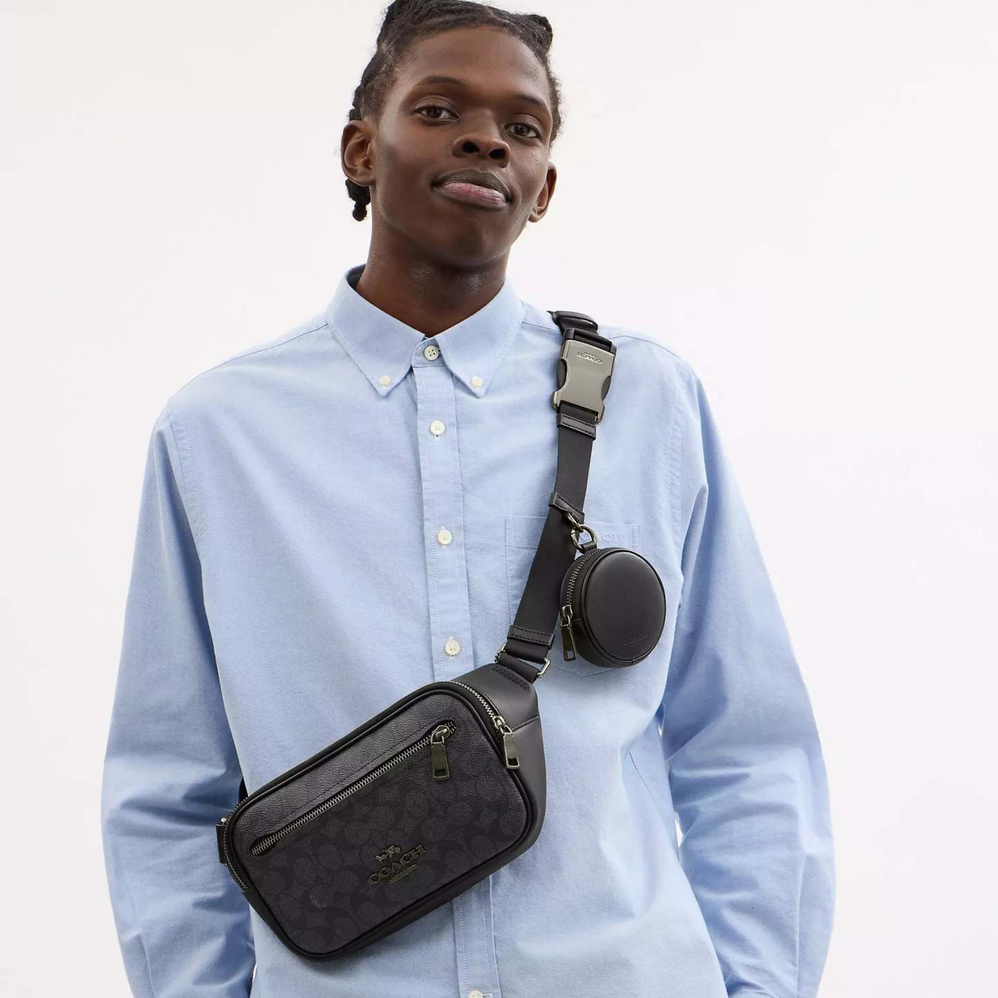 Signature coated canvas and smooth calf leather Belt bag - Inside multifunction pocket Zip closure fabric lining Outside zip pocket Adjustable strap with 48 length for wear at waist 11 1/4 (L) x 5 1/2 (H) x 2 1/4 (W) Removable round coin case - Zip closure fabric lining Attached hinged D-ring 3 1/2 (L) x 3 1/2 (W) x 1 (W) Style No. CZ400 | Coach Outlet Elias Belt Bag In Signature Canvas - Multi