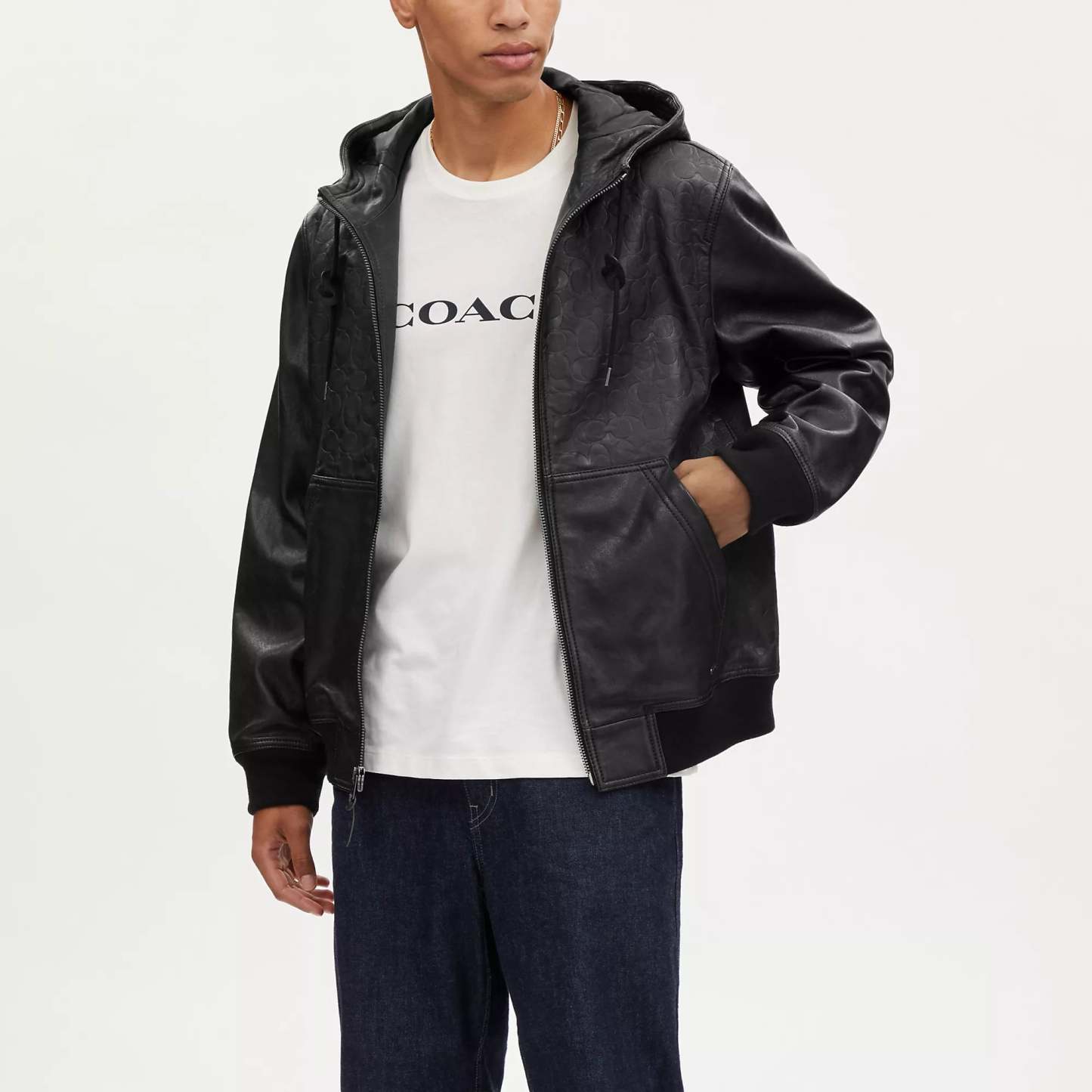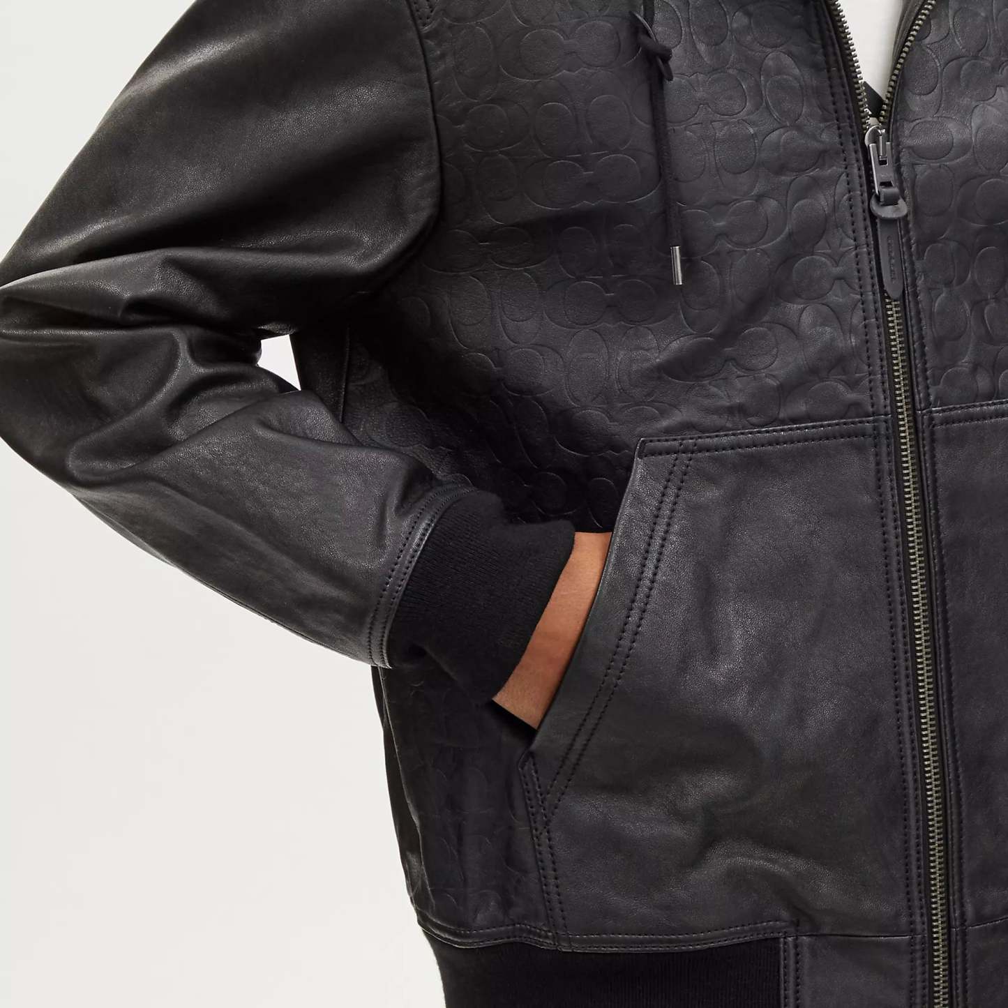 100% lamb leather Knit rib - 64% acrylic 27% wool 8% polyamide 1% elastane Lining - 56% polyester 44% viscose Zip closure Slip pockets Length - 26 3/4 Model is 6'2 (188cm) and wears a size M Style No. CK513 | Coach Outlet Embossed Leather Trainer - Black, Size - Medium