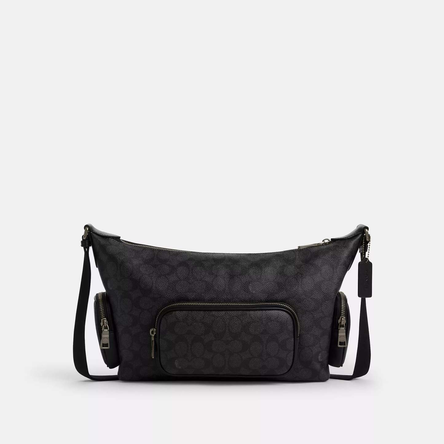 Signature coated canvas and smooth calf leather Inside zip pocket Zip-top closure fabric lining Outside zip pockets Adjustable strap with 25 drop for shoulder or crossbody wear 12 1/2 (L) x 9 1/4 (H) x 3 3/4 (W) Style No. CCG18 | Coach Outlet Finn Crossbody Bag With Pockets In Signature Canvas - Multi